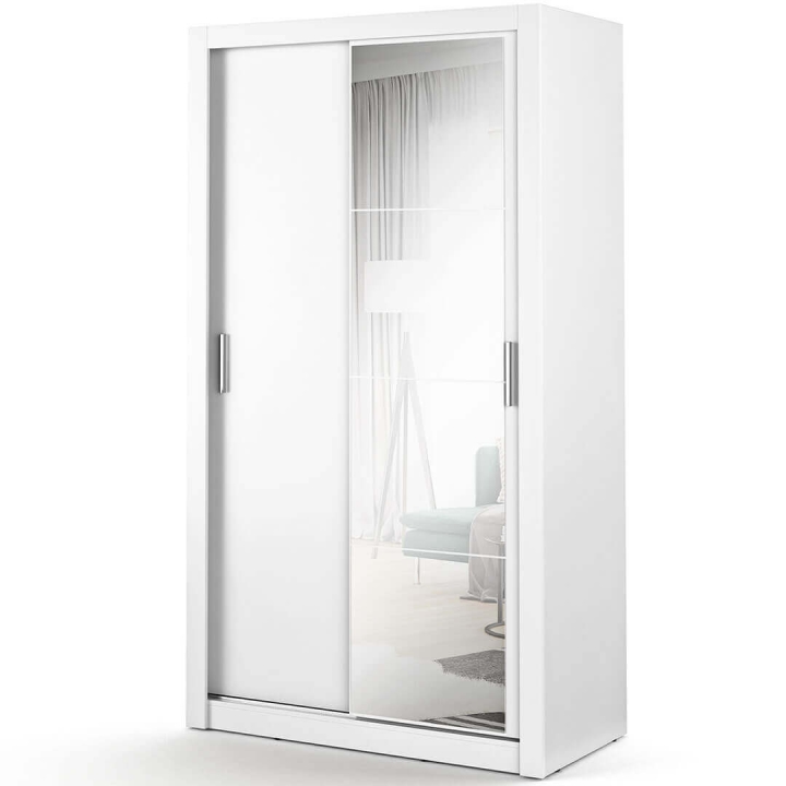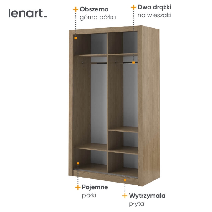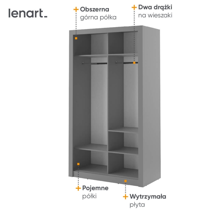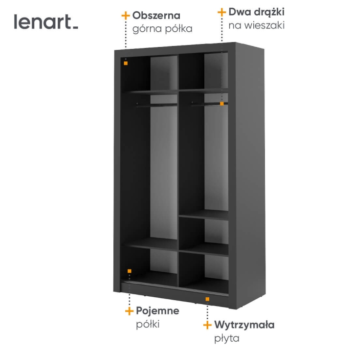 Introducing the compact Arti wardrobe , measuring 120 cm wide, 215 cm high, and 60 cm deep, ideal for smaller roomssuch as a bedroom, dressing room, hallway or youth room. Its minimalist design and functionality make it fit perfectly into a variety of interior arrangements. A mirror placed on one of the fronts optically enlarges the space, introducing more light and adding elegance. The wardrobe is equipped with two hanger rods and five capacious shelves, ensuring proper organisation of the things stored. Thanks to the upper shelf, you have space for less frequently used clothes, seasonal shoes or suitcases. Available in several colour versions, it fits easily into any interior. In addition, optional lighting allows you to emphasise its elegant appearance. Made of durable laminated board with ABS edging finish, it guarantees solidity and durability. The combination of modern style and practicality makes our wardrobe an indispensable element of any functional room. The furniture is available in 4 colour variants: black, grey, white and shetland oak.
