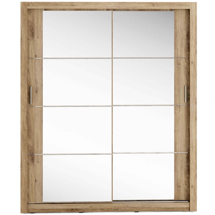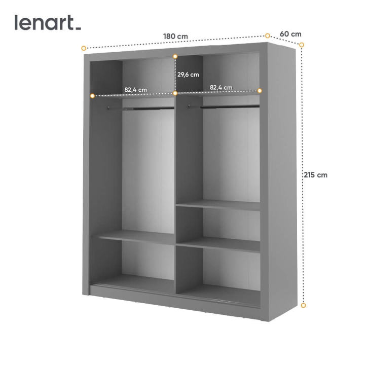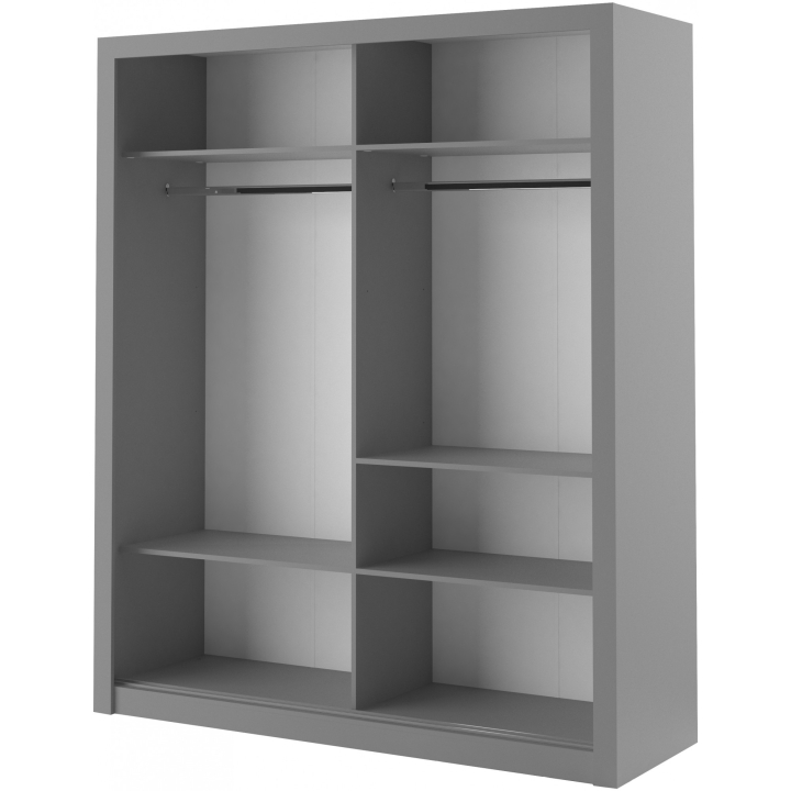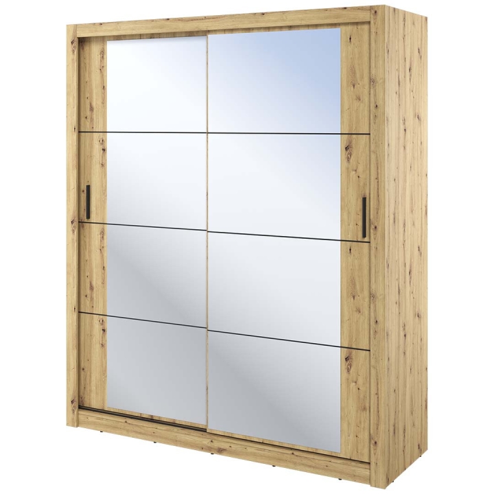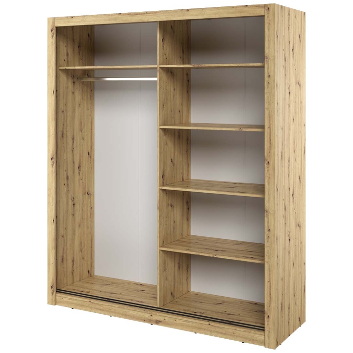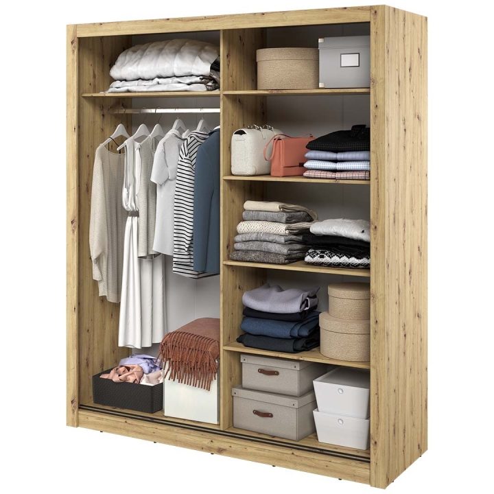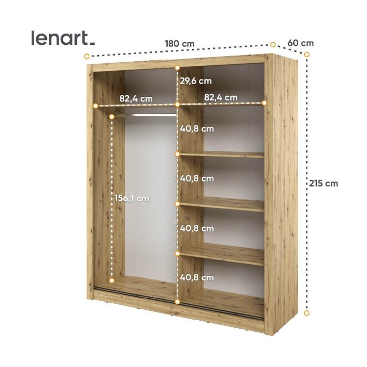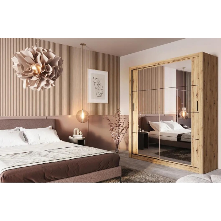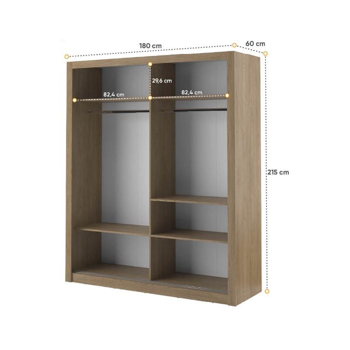 The elegant Arti wardrobe, is the perfect solution for your bedroom. The piece of furniture measures 180 cm wide, 215 cm high and 60 cm deep. Built with functionality and modern style in mind, this two-door wardrobe offers plenty of storage space. Its sliding doors make it easy to access the interior, while the mirrors on them add elegance and optically enlarge the space. Equipped with two rods and five shelves, it allows you to store clothes and accessories according to your needs. The furniture needs to be assembled, but thanks to the careful workmanship and high-quality materials, the wardrobe will last for many years. Find the perfect wardrobe for your bedroom today! The furniture is available in 3 colour options: shetland oak, artisan oak, and grey.