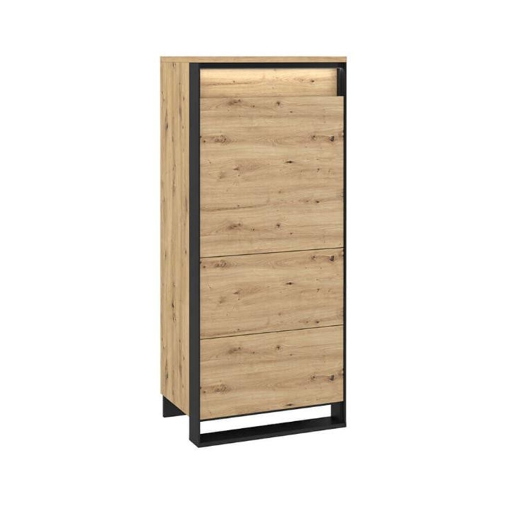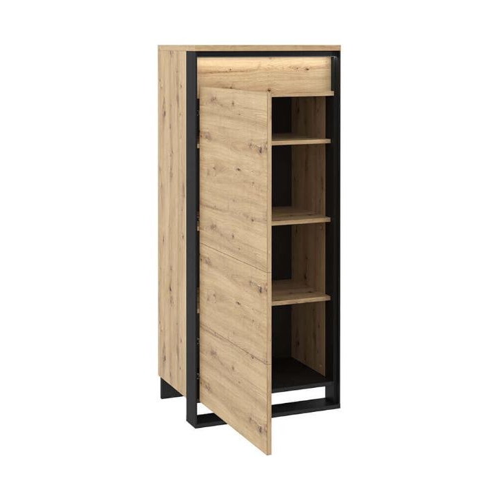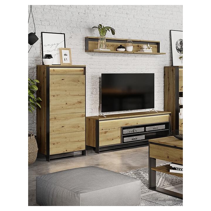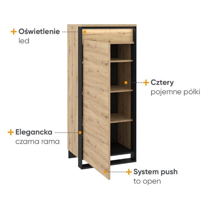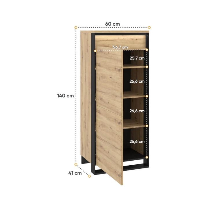 The modern Quant cabinet is a combination of elegance and functionality that impresses with its design. The black, slender details harmonise perfectly with the finish imitating the natural wood of artisan oak, giving the furniture an unusual loft character. The cupboard measures 60 cm wide, 140 cm high and 41 cm deep, ensuring comfortable use in everyday life, while the 4 capacious shelves will provide the necessary space for clothes and other accessories. Assembling the furniture is simple and intuitive, making it ready for use in no time. This elegant cabinet will be the perfect addition to a modern living room, adding style and functionality.
