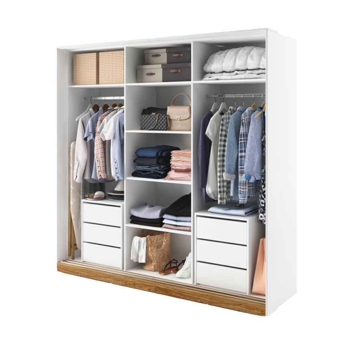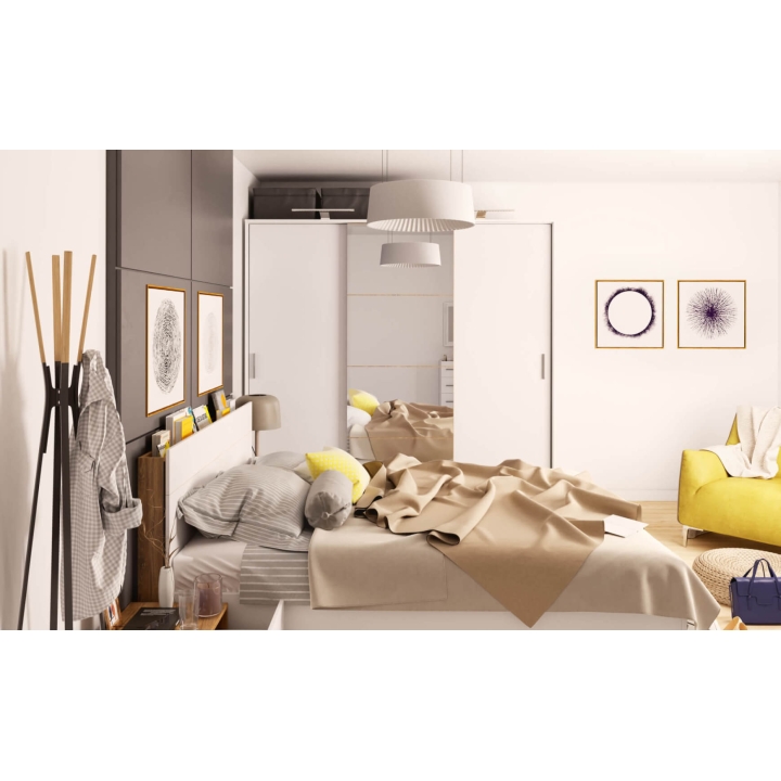 The very capacious and functional Dentro wardrobe with dimensions: 220 cm wide, 215 cm high and 63 cm deep, it is the ideal piece of furniture for a bedroom or dressing room. Equipped with three sliding doors that save space in the room, the wardrobe looks modern and stylish. The colour combination of white and stirling oak gives the piece of furniture elegance, harmonising with a variety of interior designs. The mirror mounted on the central front optically enlarges the space, adding pleasant lighting to the room. The interior of the wardrobe is designed to make practical use of the available space, offering two hanger rods and six shelves, perfect for storing a variety of items. The symmetrical layout of the interior makes it easy to share the space fairly with a partner or partner. The wardrobe is also compatible with ID-13 pedestals and energy-saving LED-2S led lighting, further enhancing its functionality.