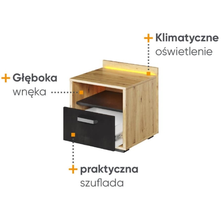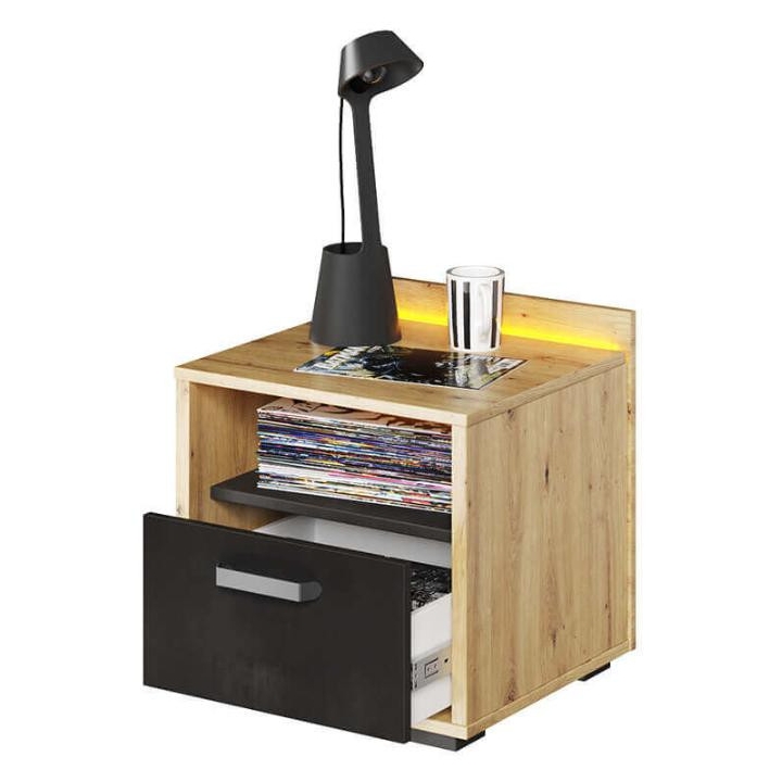 The Qubic bedside table is a practical solution for a youth room, combining functionality with modern style. The furniture measures 45 cm wide, 47 cm high and 42 cm deep, and its large drawer and easy-access recess provide convenient storage for favourite items such as books or trinkets. The table is distinguished by its interesting design, with its cubist shape, recessed drawer front and unusual colour combination of artisan oak décor and raw steel, which gives it a unique character. In addition, the metal handles and led lighting (included) of the solid emphasise the modern look of the furniture. Made of durable laminated board protected by ABS edging, the bedside table is not only aesthetically pleasing, but also durable and easy to keep clean.