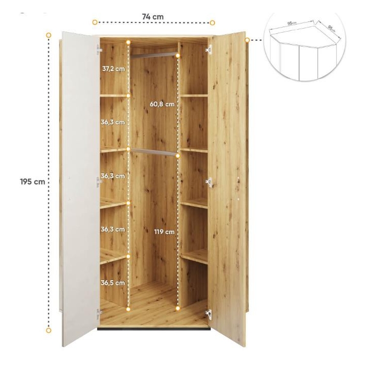 The Qubic corner wardrobe, is the perfect solution for a youth room, combining functionality with modern style. With two doors and a capacious interior, it provides convenient storage and display of a variety of items. Measuring 95 cm wide, 195 cm high and 95 cm deep, the furniture is equipped with eight practical shelves to organise clothing and school accessories, as well as two rods. Its unique design, based on geometric shapes and a patchwork colour scheme in shades of grey, and wood, attracts attention and adds character to the room. The metal handles add further aesthetic appeal. Made of durable laminated board, the wardrobe ensures durability and ease of cleaning, while being a functional and stylish addition to the interior.