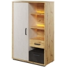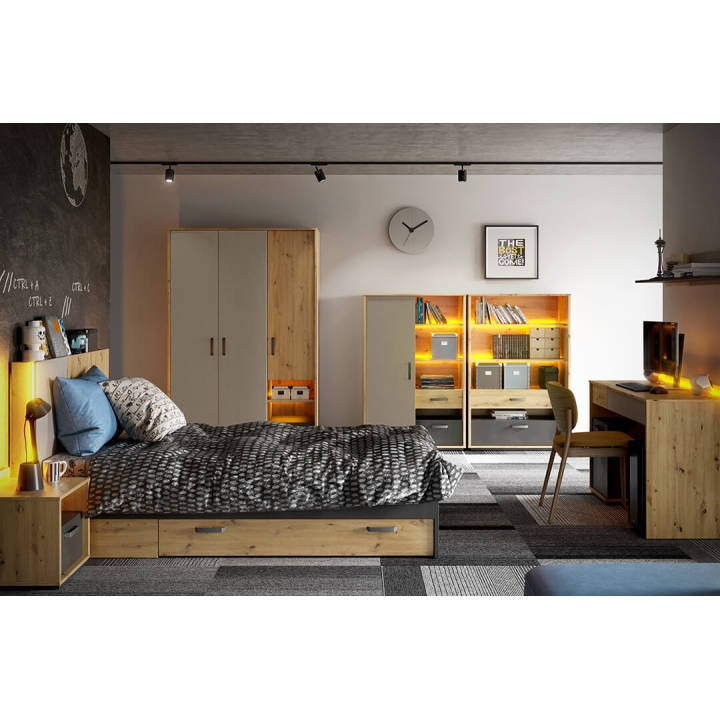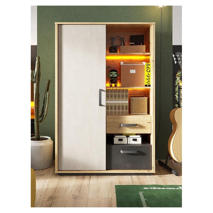 The Qubic cabinet, is the perfect solution for a youth room, combining functionality with modern style. With one door and two drawers, it provides convenient storage and display of a variety of items. Measuring 90 cm wide, 138 cm high and 42 cm deep, the piece of furniture is equipped with four practical shelves to organise clothing and school accessories. Its unique design, based on geometric shapes and a patchwork colour scheme in shades of grey, wood and raw steel, attracts attention and adds character to the room. Metal handles and led lighting (included) add further aesthetic appeal. Made from durable laminated board, the cabinet ensures durability and ease of cleaning, while being a functional and stylish addition to the interior.