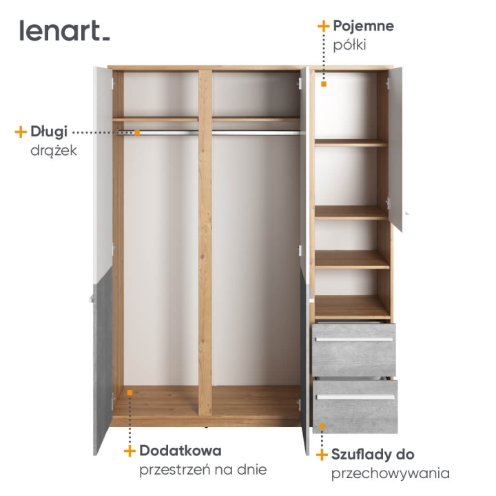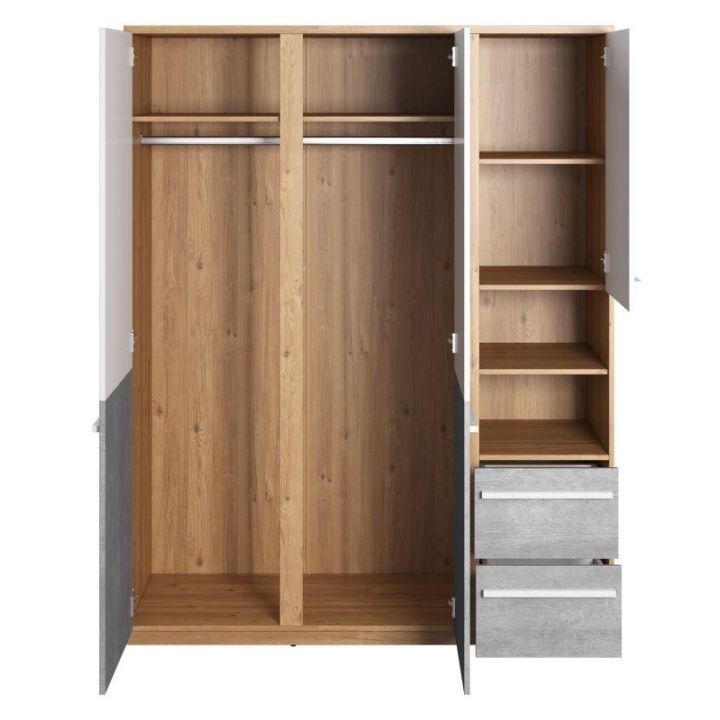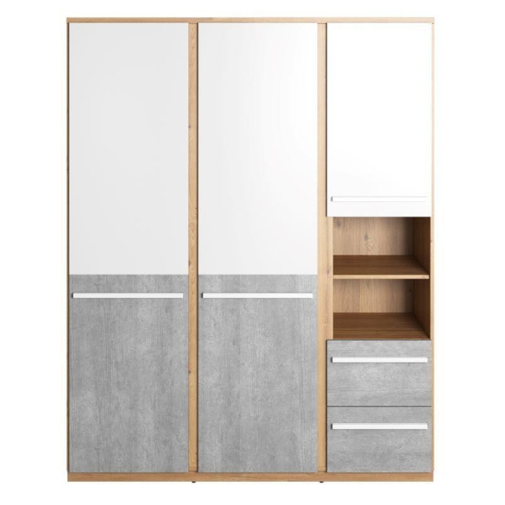 The Plano three-door wardrobe is the perfect solution for youth rooms where efficient space management is important. Equipped with two rods and two drawers, it provides plenty of space for clothes, shoes and accessories for easy storage. Measuring 150 cm wide, 191 cm high and 51 cm deep, the wardrobe is a sturdy construction that will accommodate all your essentials. The modern colour combination of nash oak, white and grey makes it suitable for different room arrangements, regardless of gender. In addition, the original handles add character to the front of the wardrobe, giving it a unique look.