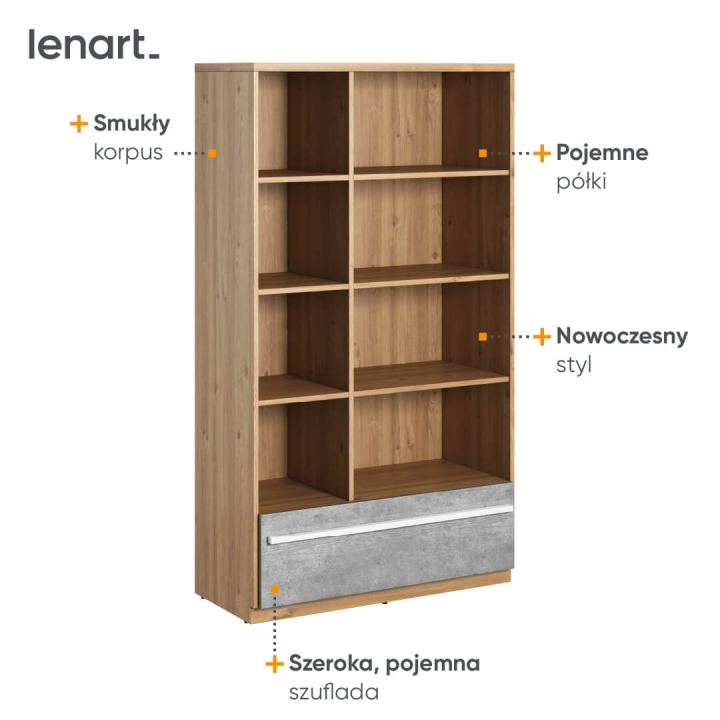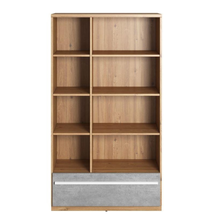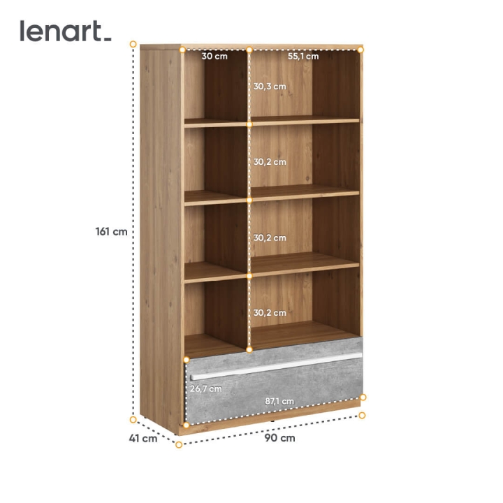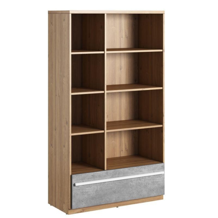The Plano bookcase is an original piece of furniture, measuring 90 cm wide, 161 cm high and 41 cm deep , which has been equipped with a wide, capacious drawer in which you can comfortably store, for example, documents or small items. The slim body, the oak-coloured shelves in composition with the grey drawer make the bookcase look modern and will easily fit into different styles. The furniture is great for displaying, for example, books, decorations and other essential items on its six capacious shelves.