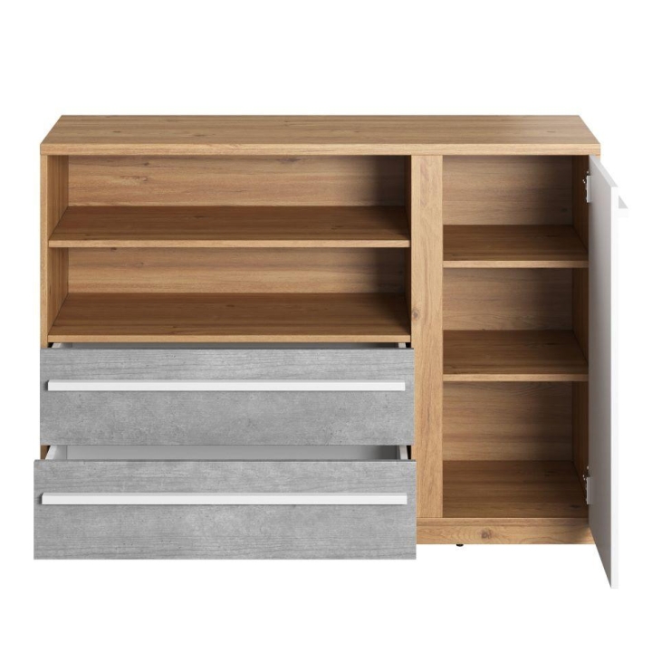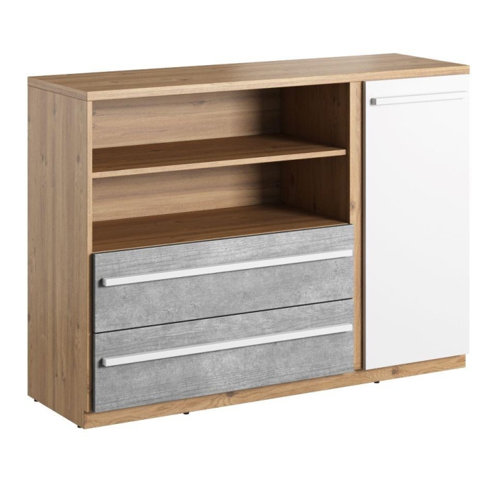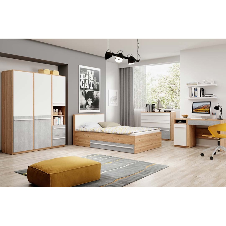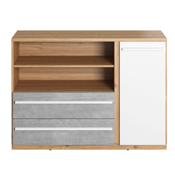 The modern Plano chest of drawers with two easy-access drawers, a cupboard and two niches will make it easy to store whatever you want - toys, school accessories or your innermost treasures. Its ergonomic dimensions make it a perfect fit for many interior settings, while its width of 125 cm, height of 91 cm and depth of 41 cm provide ample capacity and elegance. The modern character of the chest of drawers is emphasised by the original combination of colours - white, grey and a warm, wood-like décor. These elements guarantee that furniture from the PLANO collection will not go out of fashion for a long time. The chest of drawers is a perfect match for various interior design styles, both in girls' and boys' rooms.