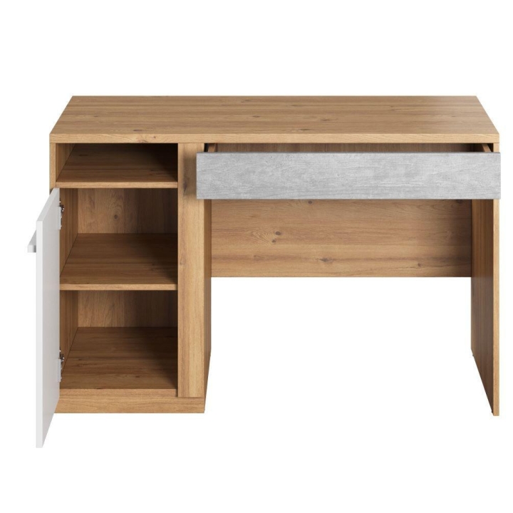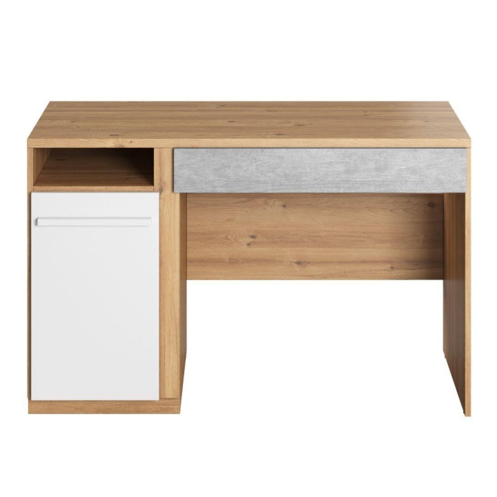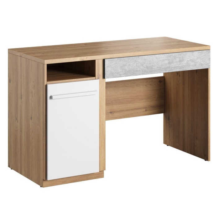Measuring 120cm wide, 76cm high and 55cm deep, the modern Plano desk is the perfect solution for youth rooms, offering both functionality and style. Designed with comfort and convenience in mind , the desk features one drawer under the top and a handy recess, ideal for storing school supplies. Its ergonomic top provides adequate space for working and studying. A large cupboard with doors allows for organised storage of notebooks, books and other essential items. The desk is equipped with two practical shelves, which further increase its functionality. Made in the trendy colour scheme of oak nash/mite grey/white, the desk looks modern and stylish, adding character to any youth room. The furniture requires assembly.