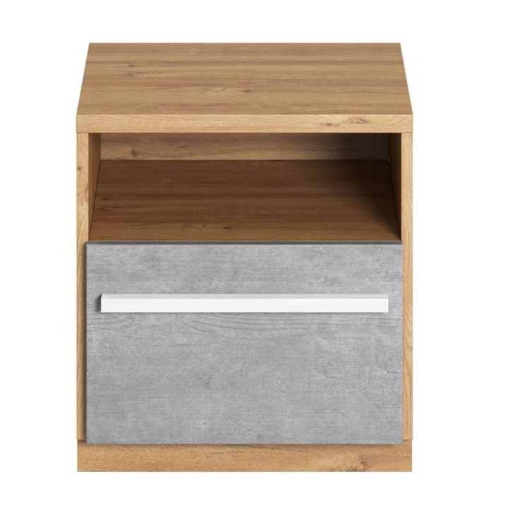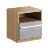 The Plano bedside table in modern style is the perfect solution for a youth room. The furniture measures 45 cm wide, 50 cm high and 41 cm deep. Thanks to its functional design with a niche and drawer , you can easily store essential items within easy reach. Ideal as a bedside lamp stand or a place for your favourite book before bedtime. Assembly of the furniture is extremely easy. The colour scheme in shades of oak, grey and white matches many interiors, adding a modern touch. The robust construction and compact dimensions mean that the table fits perfectly even in small spaces.