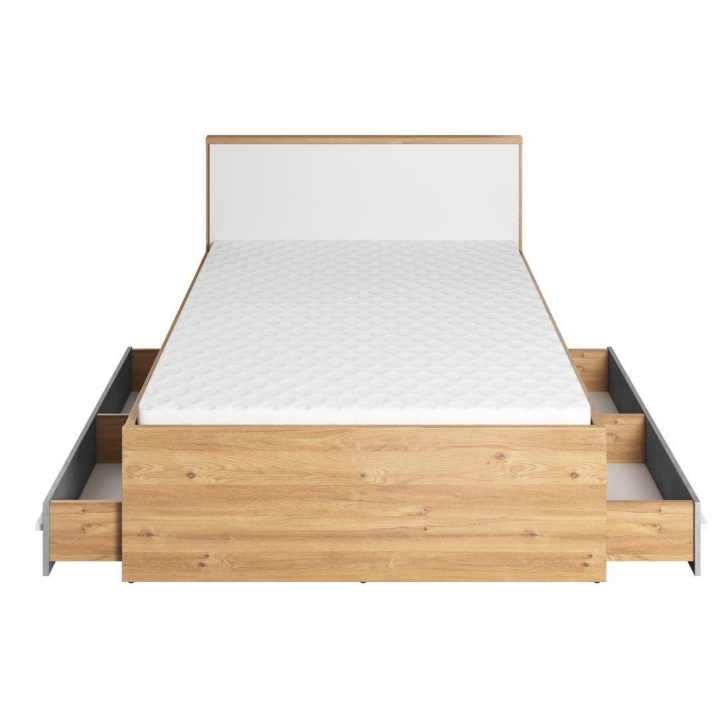 The modern Plano bed with its elegant appearance and functional design will be a perfect addition to a youth room. With two capacious drawers under the bed, it will provide additional storage space for bedding, duvets or other items. The high headrest guarantees comfort during evening rest or reading. The bed is characterised by dimensions of 127 cm wide, 86 cm high and 211 cm deep. Its colour scheme gives the room a modern look. The furniture needs to be assembled, but the end result will certainly reward this. This bed is not only a piece of furniture for sleeping, but also a design accent that will enrich the décor of any youth room.