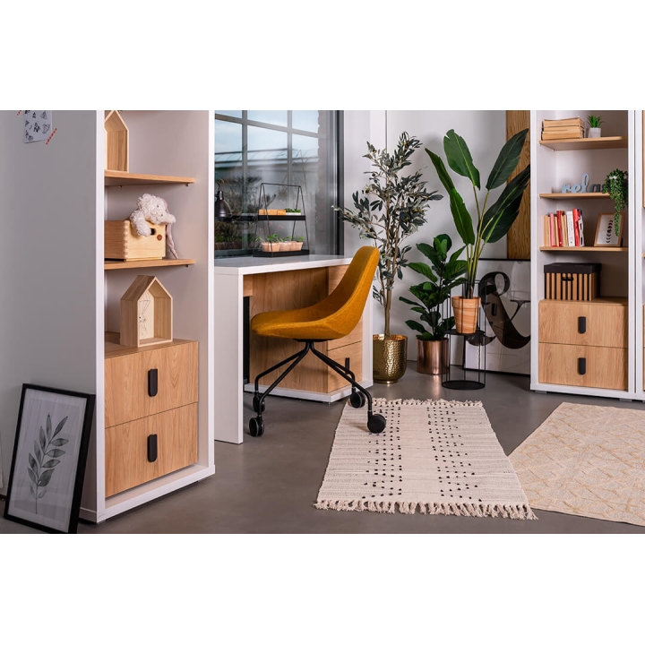The Simi tall bookcase, with five shelves, is the perfect solution for storing books and accessories. Measuring 55 cm wide, 200 cm high and 55 cm deep, the furniture hastwo capacious drawers at the bottom, which are ideal for storing linen and other small items. The composition of white and the warm shade of natural hickory gives the bookcase a modern yet cosy look that blends in perfectly with any interior. The solid construction made of durable laminated board guarantees durability and stability. The furniture needs to be assembled, but thanks to the simple instructions this will be an easy task. This elegant bookcase fits perfectly in a youth room, creating a functional and stylish storage space.