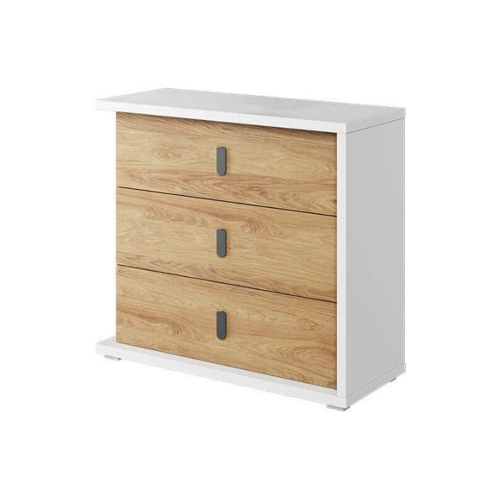 The modern Simi chest of drawers, in a colour scheme combining white and natural hickory, is an excellent choice for modern interior design. The furniture, measuring 100 cm wide, 90 cm high and 41 cm deep, is extremely roomy. With three capacious, easy-access drawers and a clever internal layout, it provides plenty of storage space for linen, documents or accessories. Its style combines modernity with a touch of tradition - white and warm wood tones create a cosy atmosphere in the youth room. The chest of drawers features a sturdy construction made of durable laminated board, which ensures durability and easy cleaning. The furniture is easy to assemble and the striking design of the chest of drawers is sure to catch the eye and add variety to any interior.