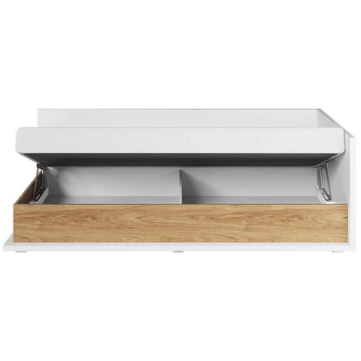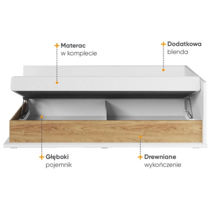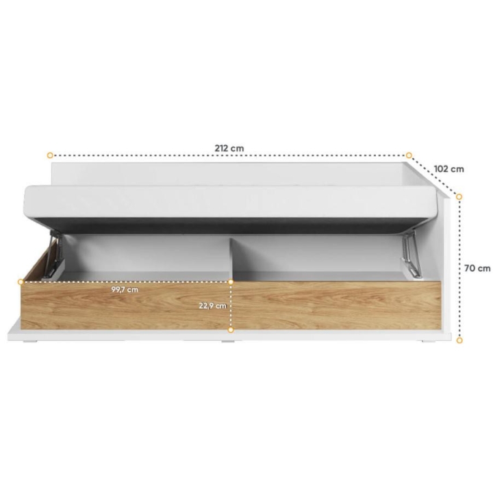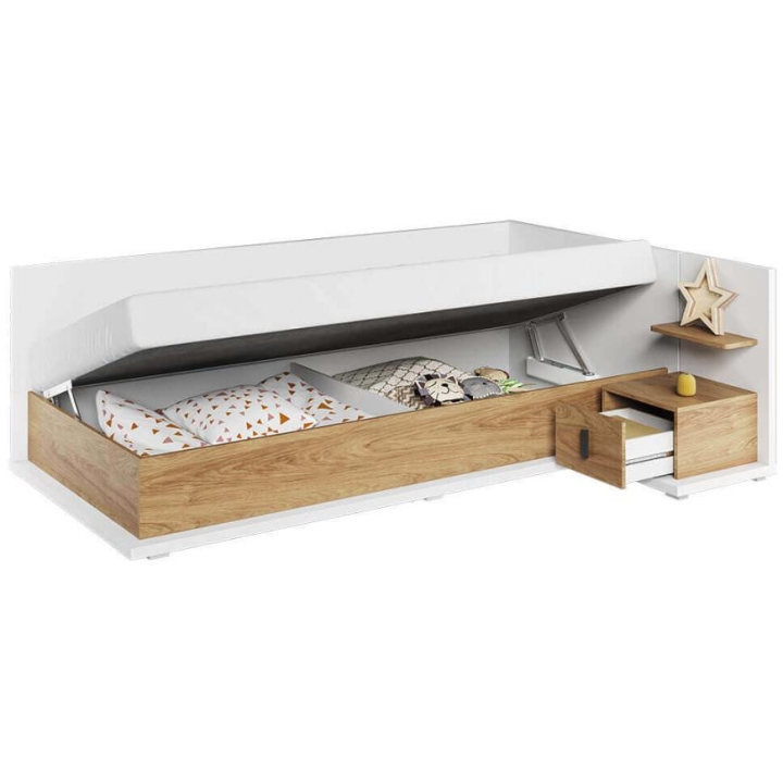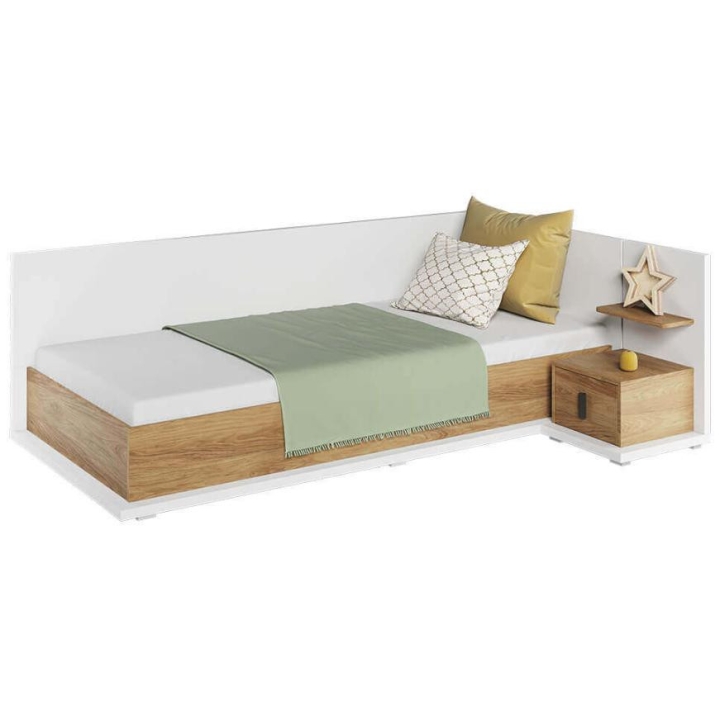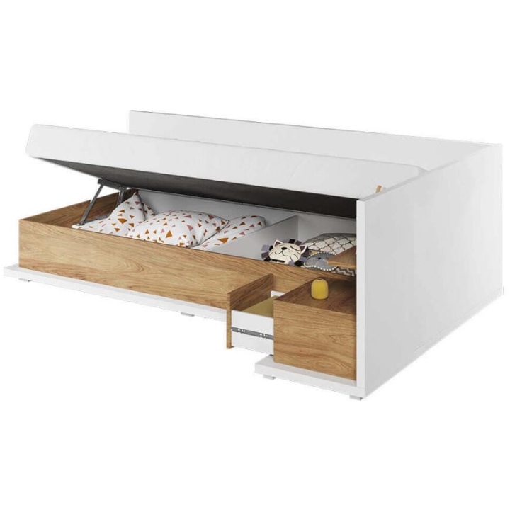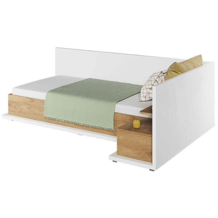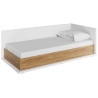 The comfortable and practical Simi single bed is the ideal solution for a youth room or bedroom. Measuring 102 cm wide, 70 cm high and 212 cm deep, this piece of furniture has a modern style characterised by the combination of white with a decor in a warm natural hickory colour, giving it a cosy look to suit a variety of interiors. The top and side of the bed have been secured with an additional blending, allowing it to be used as a sofa - simply complement it with cushions for a comfortable backrest. Inside the bed, there is an extra deep storage compartment for bedding, blankets and other items, making the most of the space. The bed comes complete with a comfortable bonell mattress for a comfortable night's sleep. The furniture is made of durable laminated board, finished with durable ABS edging, which guarantees its solidity and ease of maintenance. Assembly is essential, but thanks to the simple folding process, the bed will be ready for use in no time, adding functionality and style to any room. Right-hand version.