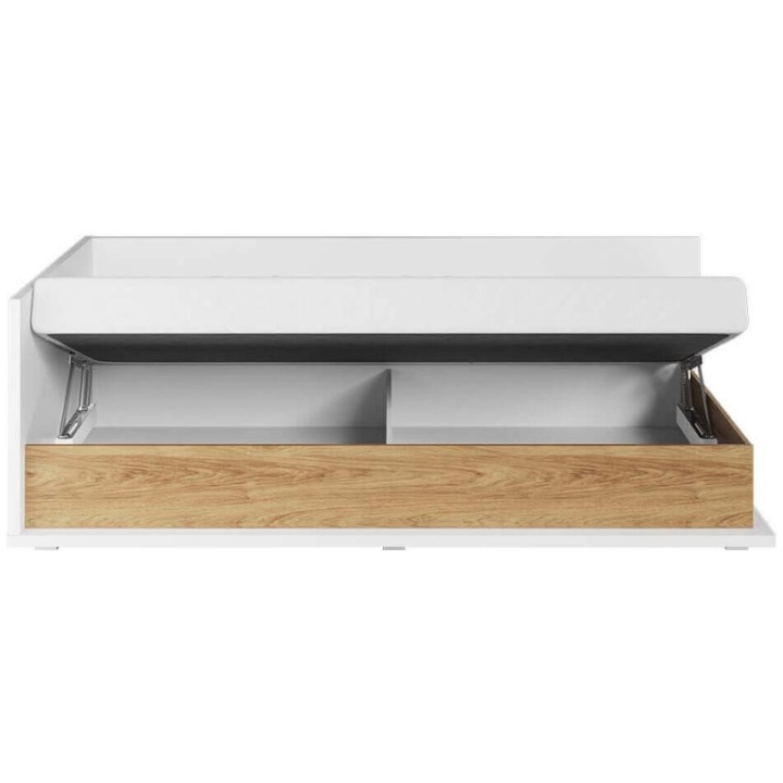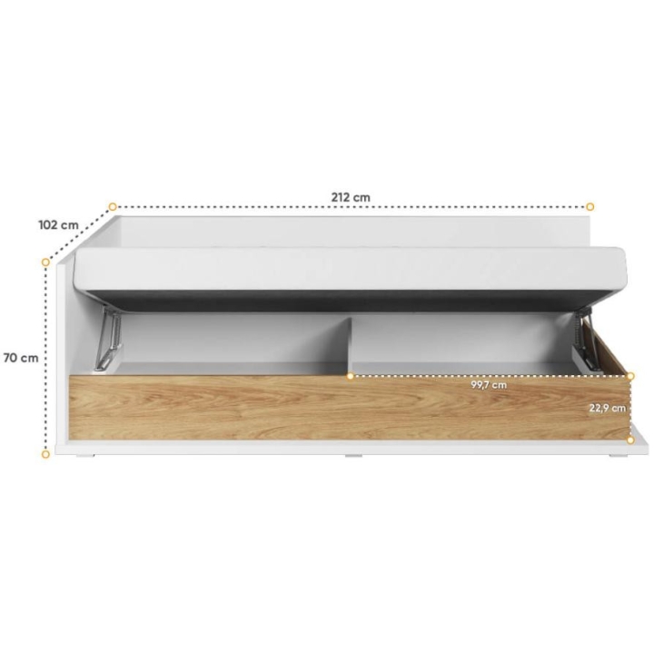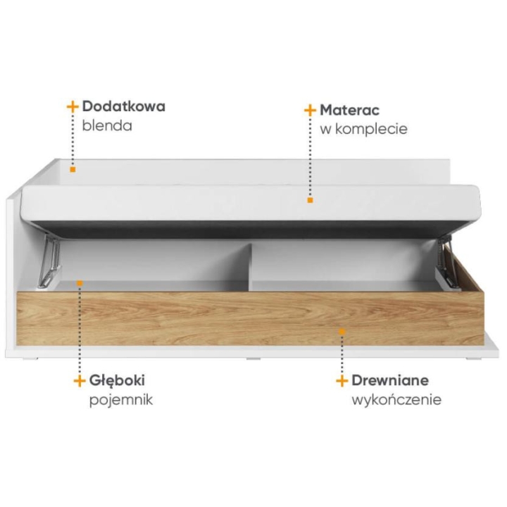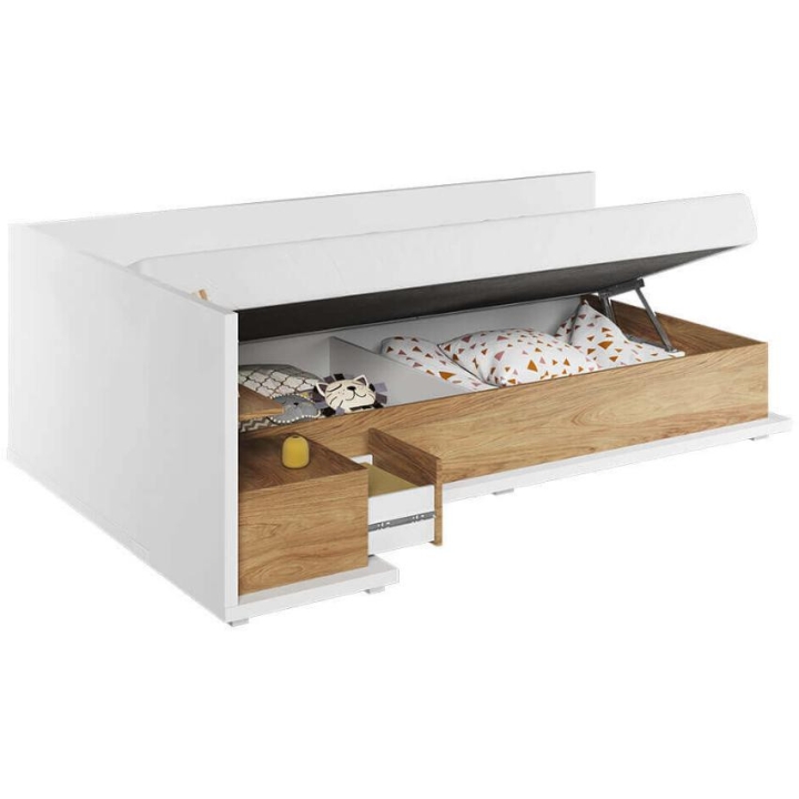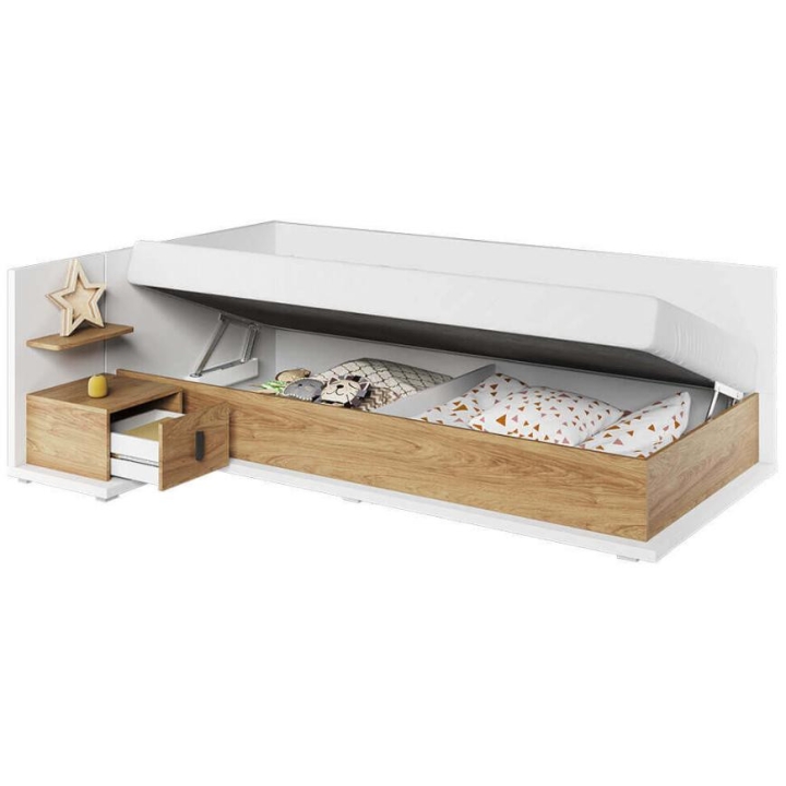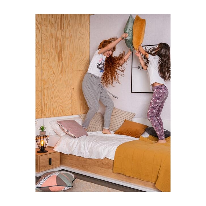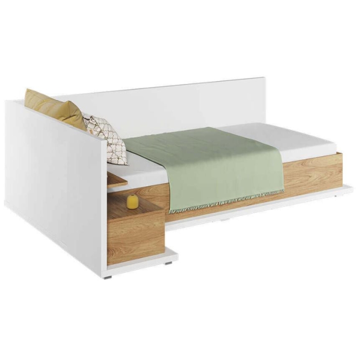 The comfortable and practical Simi single bed is the perfect solution for a youth room or bedroom. Measuring 102 cm wide, 70 cm high and 212 cm deep, this piece of furniture has a modern style characterised by the combination of white with a decor in a warm natural hickory colour, giving it a cosy look to suit a variety of interiors. The top and side of the bed have been secured with an additional blending, allowing it to be used as a sofa - simply complement it with cushions for a comfortable backrest. Inside the bed, there is an extra deep storage compartment for bedding, blankets and other items, making the most of the space. The bed comes complete with a comfortable bonell mattress for a comfortable night's sleep. The furniture is made of durable laminated board, finished with durable ABS edging, which guarantees its solidity and ease of maintenance. Assembly is essential, but thanks to the simple folding process, the bed will be ready for use in no time, adding functionality and style to any room. Left-hand version.