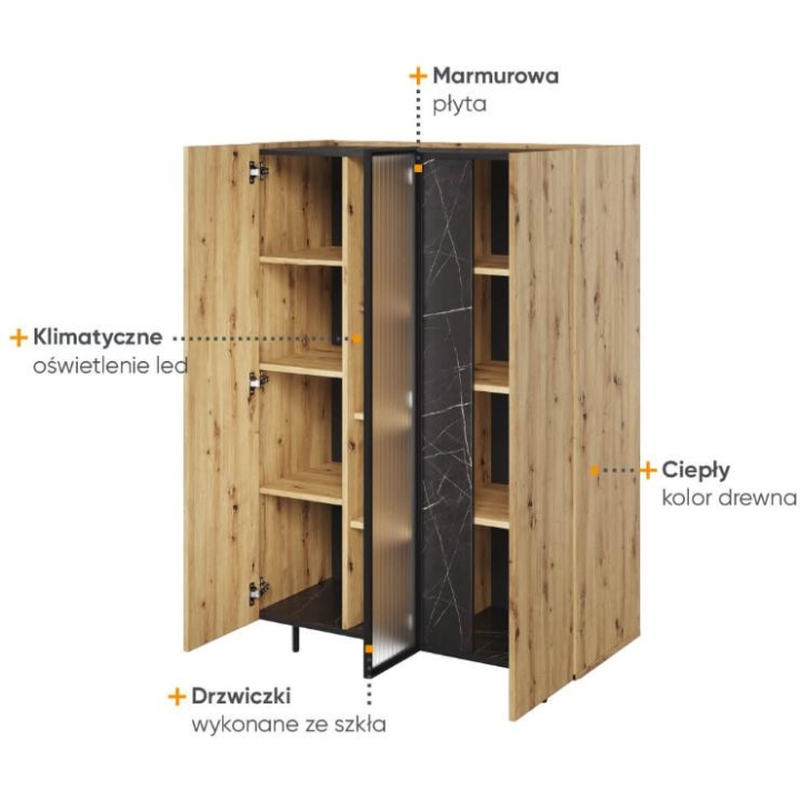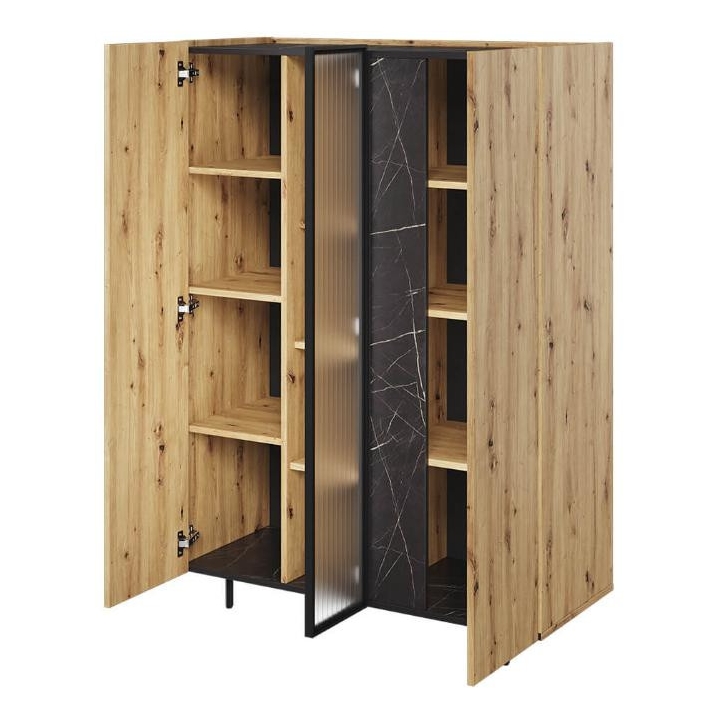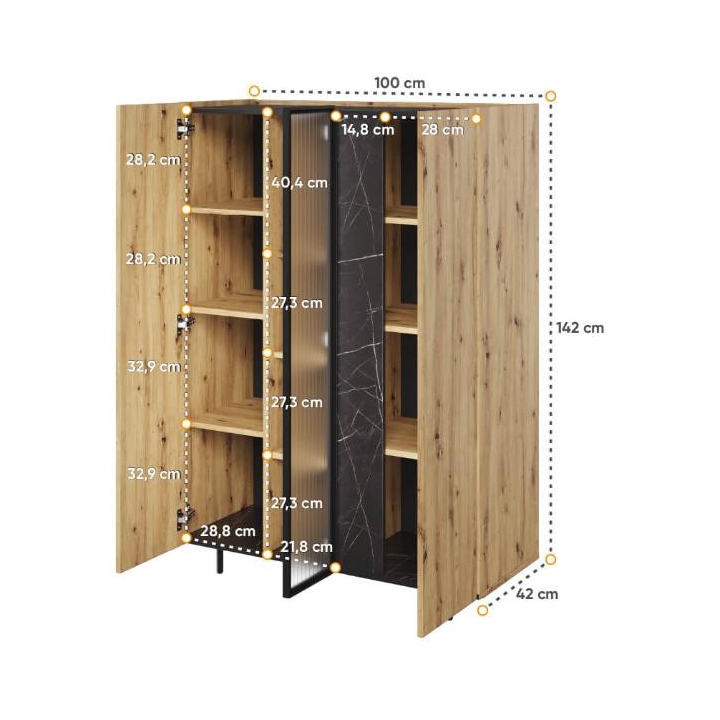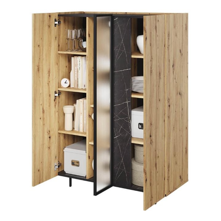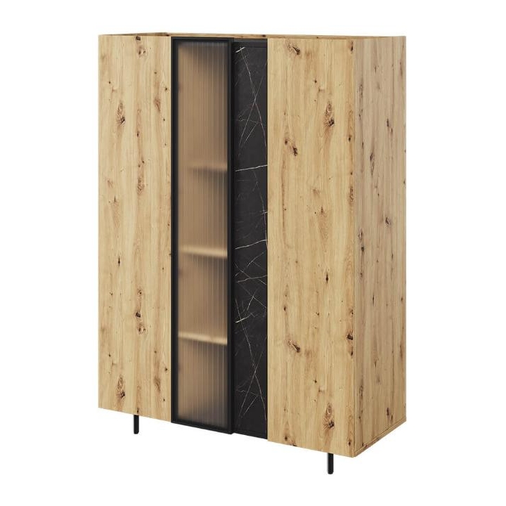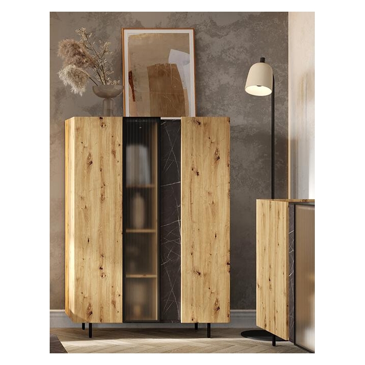 The sophisticated and practical Marmo cabinet is the perfect solution for your living room. The MARMO collection offers modern solutions for those who appreciate original design. Measuring 100 cm wide, 142 cm high and 42 cm deep, the cabinet provides plenty of storage space for documents and clothes. The combination of artisan oak and san sebastian décor, presents an elegant look that suits many interiors. The slender legs add lightness, while the black imitation marble slab and master ligne ornamental glass give the interior a modern feel. The glazed door allows you to display your favourite decorations, while the lighting included adds to the ambience. This modern cabinet is sure to delight lovers of designer interiors, combining style with functionality.