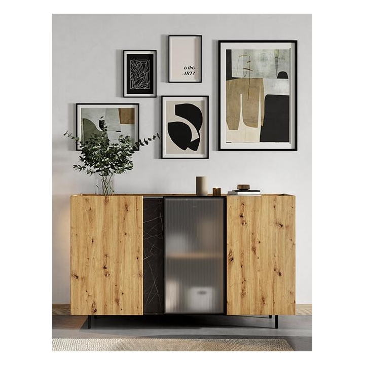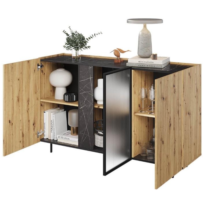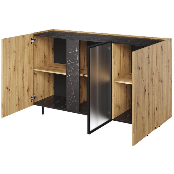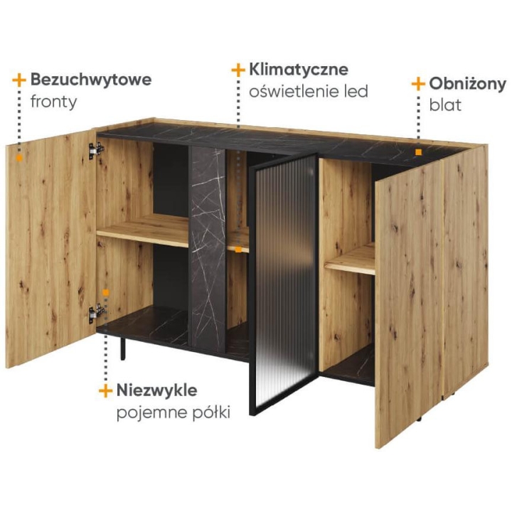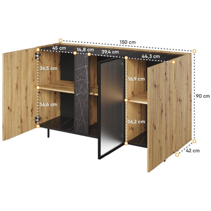 The Marmo three-door chest of drawers looks not only elegant but also functional. The furniture measures 150 cm wide, 90 cm high and 42 cm deep. Its capacious interior with six shelves will facilitate the organisation of documents and accessories, ensuring order in the living room. The lowered top will protect exposed items from possible damage in the event of a fall, while also adding to the charm of the furniture. Handleless fronts with a soft close system give the chest of drawers an aesthetically pleasing look, accentuated by the distinctive marble pattern and warm wood décor. The trendy slender legs and black accents add a modern touch, while the master ligne ornamental glass gives it a unique charm. Thanks to its functionality, the chest of drawers will be perfect for many rooms, from the living room to the dressing room, completing a stylish interior design.