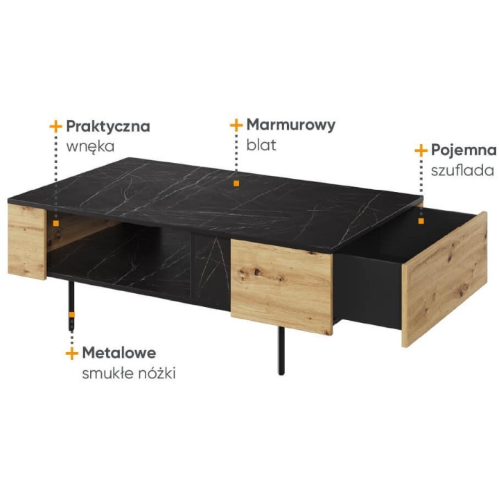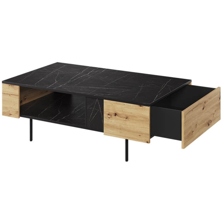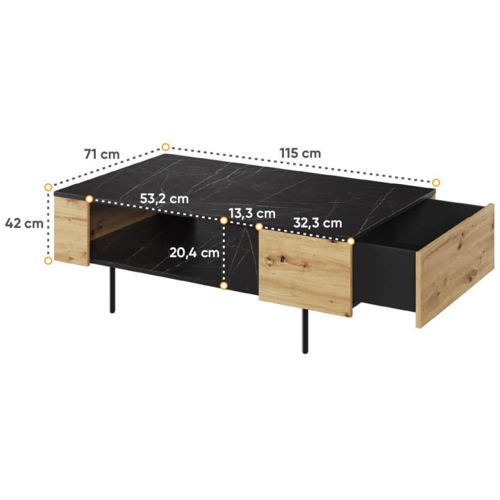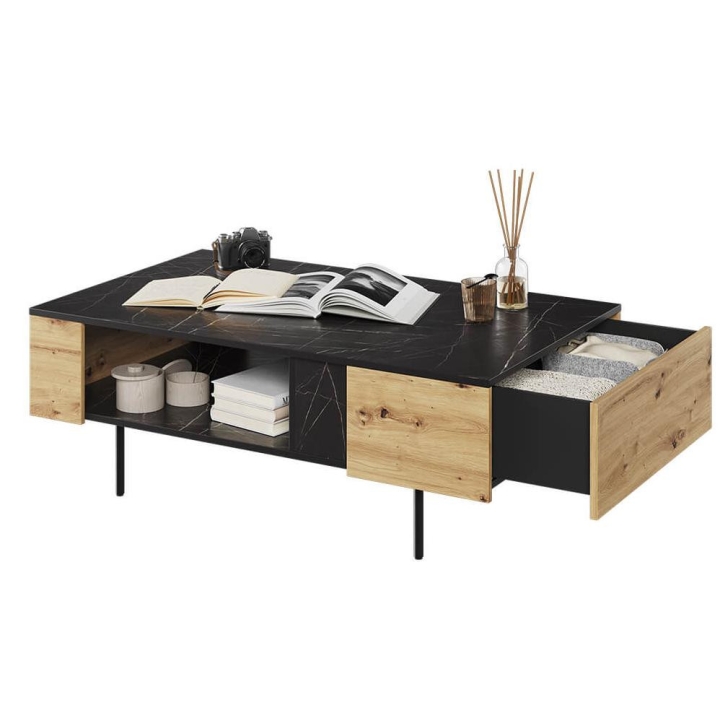 The Marmo coffee table is a sophisticated combination of elegance and functionality that fits perfectly into the arrangements of both smaller and spacious living rooms. Designed to make practical use of space, it offers a capacious drawer and a practical recess. The handle-free drawer front makes it easy to keep everything tidy, while the soft close system guarantees smooth and quiet closing. The black top with a sophisticated marble pattern in harmony with the warm artisan oak décor gives it a modern charm. The light and delicate look of the table is emphasised by the slender metal legs. The furniture measures 115 cm wide, 42 cm high and 71 cm deep. Thanks to the use of open and closed spaces, the piece of furniture fits perfectly into living rooms of different sizes, adding a designer touch. It is an extremely fashionable accessory that will emphasise the unique style of your interior and make it a place full of unique charm.