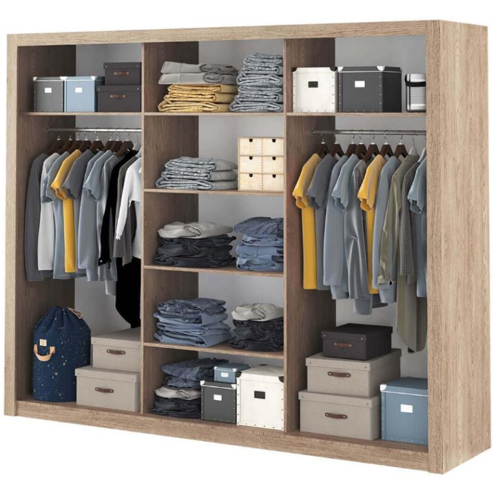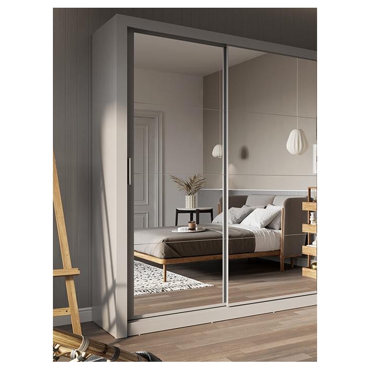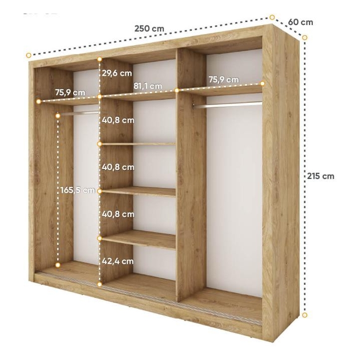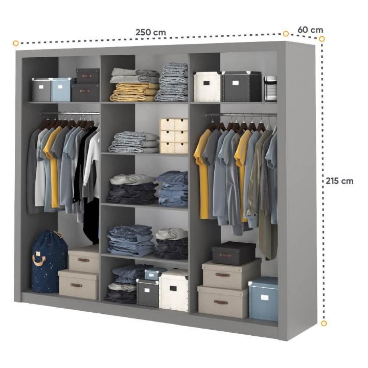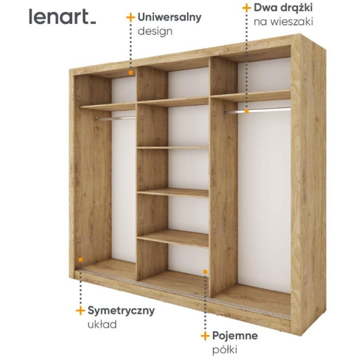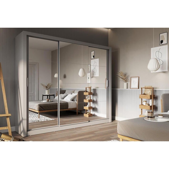 The Idea wardrobe with mirrors on the fronts is the ideal solution for a bedroom, hallway or living room. Its modern design available in 3 colours: grey, white and shetland oak will suit many interiors. The furniture is 250 cm wide, 215 cm high and 60 cm deep. Designed with practicality in mind, it includes 2 rods and 6 shelves, providing plenty of storage space for clothes and other items. The sliding doors help to save space, while the mirrors add a designer touch and also visually enlarge the interior. The furniture needs to be assembled, but thanks to the simple instructions this will not be a problem. This wardrobe is not only a practical piece of furniture, but also a stylish interior design element that will add elegance and functionality. It is possible to retrofit the wardrobe with LED lighting - LED2S.