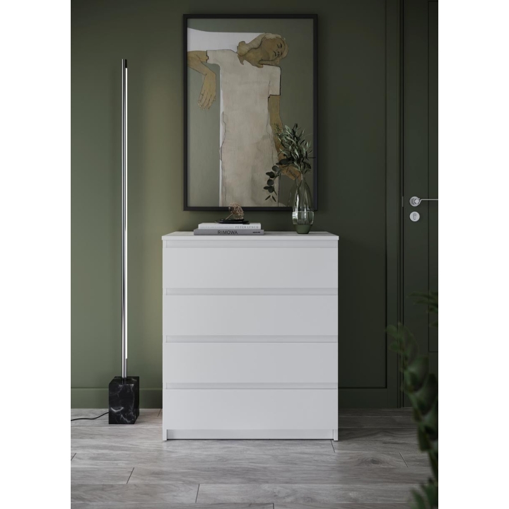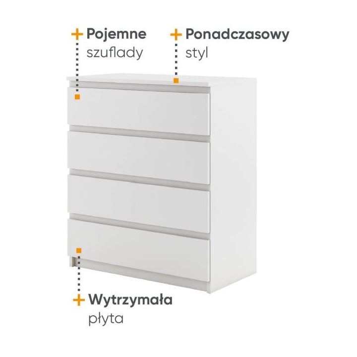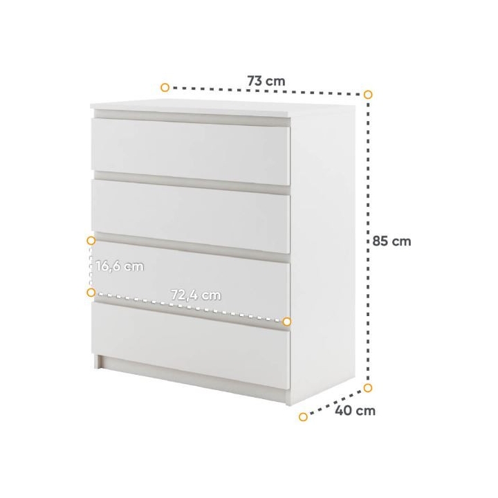 The capacious Idea chest of drawers, designed to store wardrobes, linen and other accessories, is an ideal piece of furniture for both the dressing room and bedroom. The chest of drawers is equipped with four drawers, providing plenty of storage space. Measuring 73 cm wide, 85 cm high and 40 cm deep, the furniture, with the modern style of the collection, fits perfectly into a variety of interior settings, adding elegance and functionality. The chest of drawers is available in white, making the furniture not only a practical but also an aesthetic solution. The chest of drawers is made of durable materials, which guarantees its high quality and durability. The furniture requires assembly.