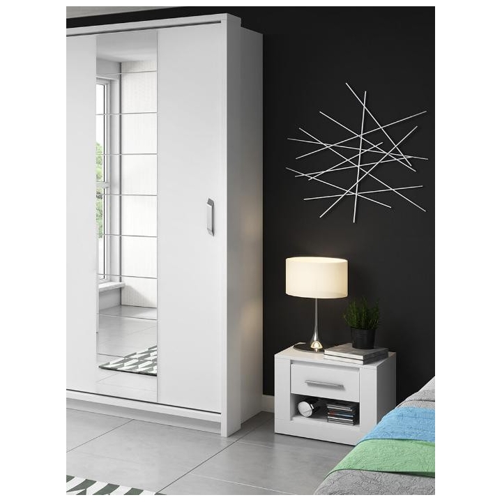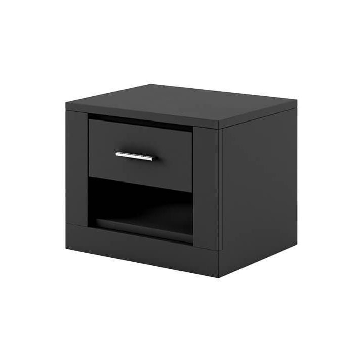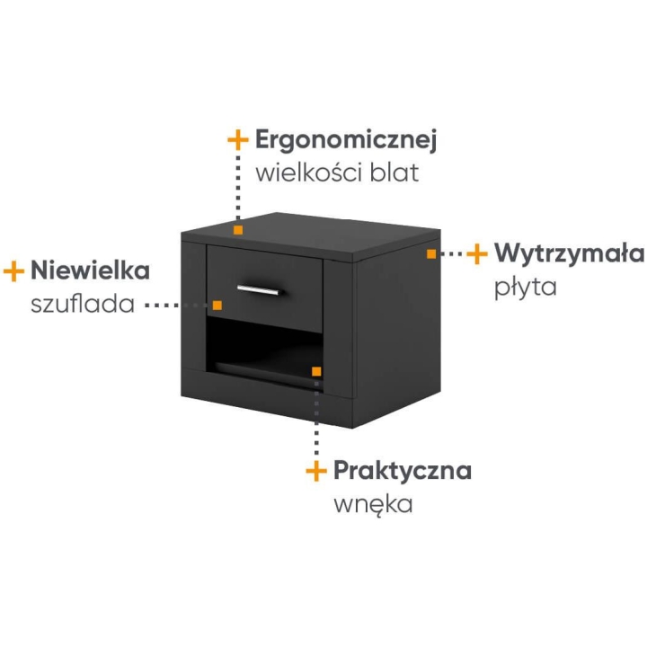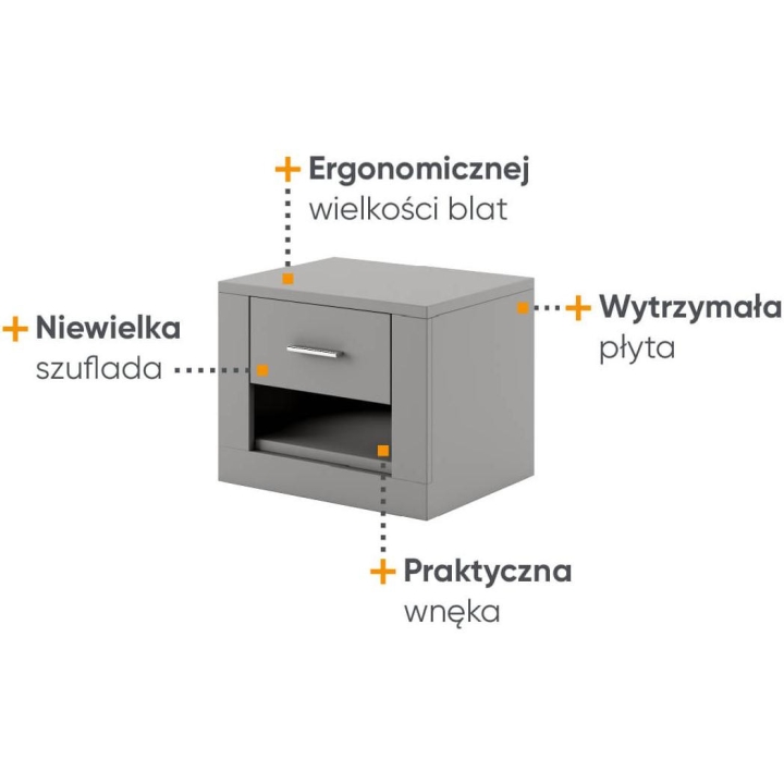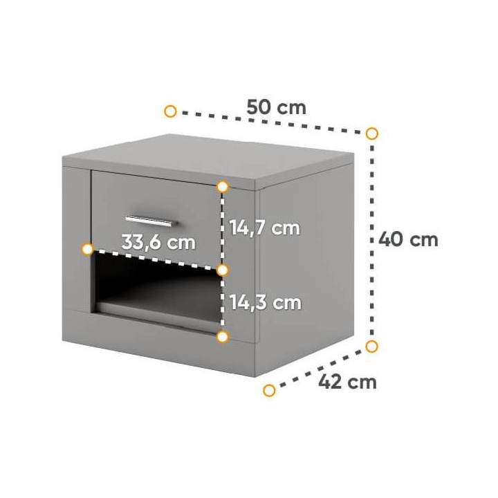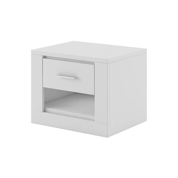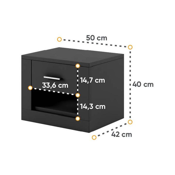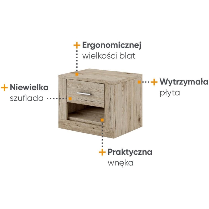 Available in 5 colours: white, grey, black, shetland oak and san remo,the Idea bedside table is the perfect choice for bedrooms and dressing rooms. The furniture, measuring 50 cm wide, 40 cm high and 42 cm deep, presents a classic design with a modern touch. Its ergonomic design makes it a perfect fit for any bed, and the small drawer will accommodate all the necessary small items you want to keep at hand. The sturdy laminated board construction guarantees long-lasting durability. The IDEA bedside table is not only a practical solution, but also a stylish interior design element that will emphasise the character of your bedroom.