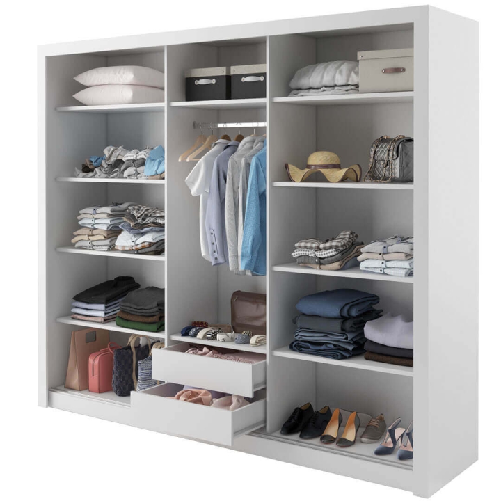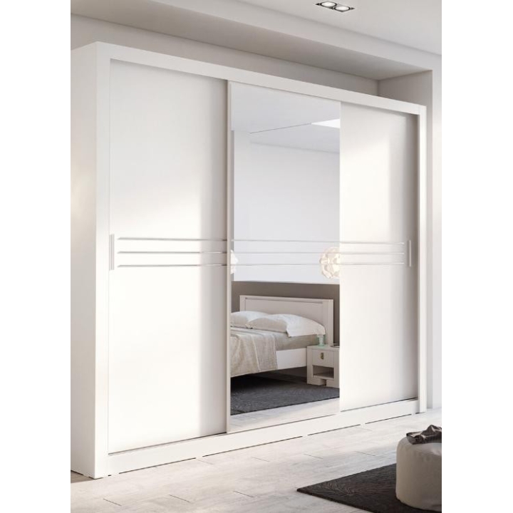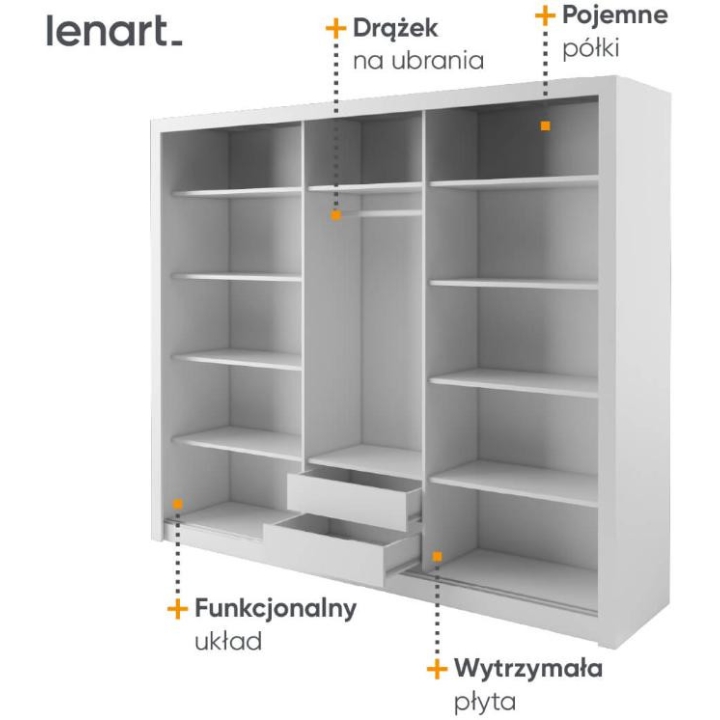 The Idea wardrobe with a mirror on the front is the ideal solution for a bedroom, hallway or living room. Its modern design, available in white, suits many interiors. The furniture is 250 cm wide, 215 cm high and 60 cm deep. Designed with practicality in mind, it includes a bar, 10 shelves, as well as 2 drawers, providing plenty of storage space for clothes and other items. The sliding doors help to save space, while the mirror adds designer charm and also visually enlarges the interior. The furniture needs to be assembled, but thanks to the simple instructions this will not be a problem. This wardrobe is not only a practical piece of furniture, but also a stylish interior design element that will add elegance and functionality. It is possible to retrofit the wardrobe with LED lighting - LED2SP.
