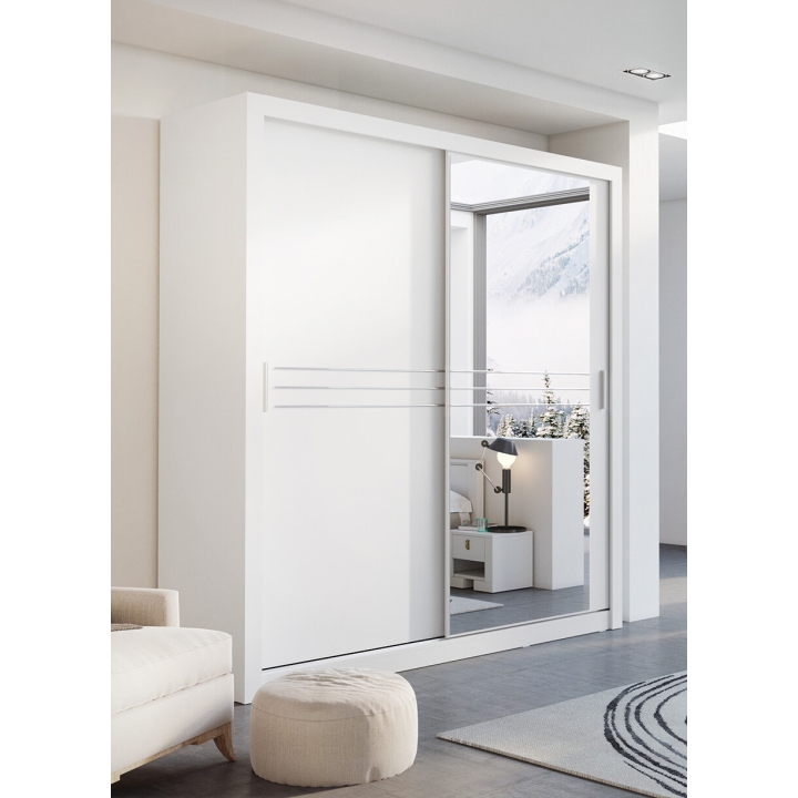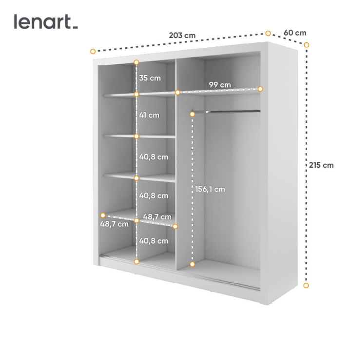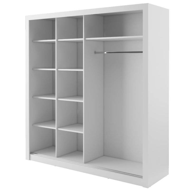 The Idea wardrobe with a mirror on the front is the ideal solution for a bedroom, hallway or living room. Its modern design, available in white, suits many interiors. The furniture measures 203 cm wide, 215 cm high and 60 cm deep. Designed with practicality in mind, it includes a bar and 8 shelves, providing plenty of storage space for clothes and other items. The sliding doors help to save space, while the mirror adds designer charm and also visually enlarges the interior. The furniture needs to be assembled, but thanks to the simple instructions this will not be a problem. This wardrobe is not only a practical piece of furniture, but also a stylish interior design element that will add elegance and functionality. It is possible to retrofit the wardrobe with LED lighting - LED2SP.