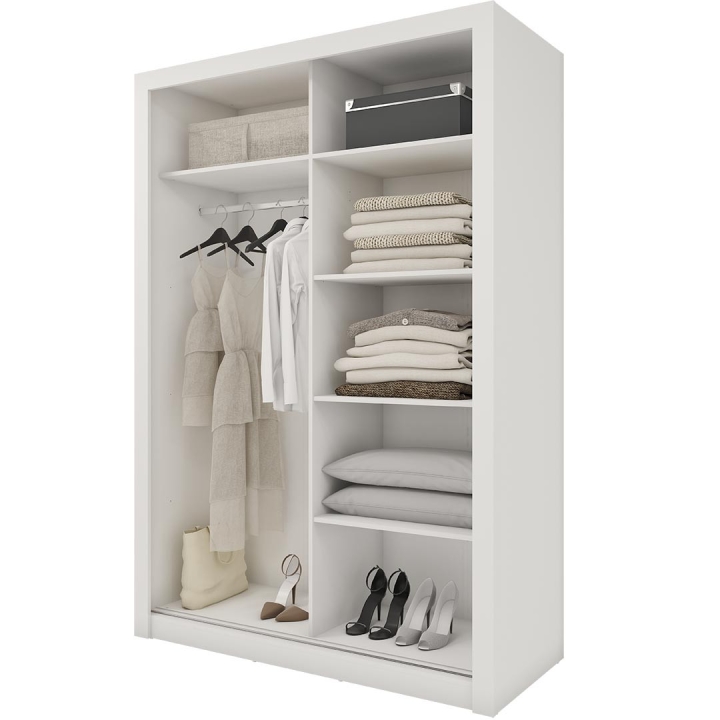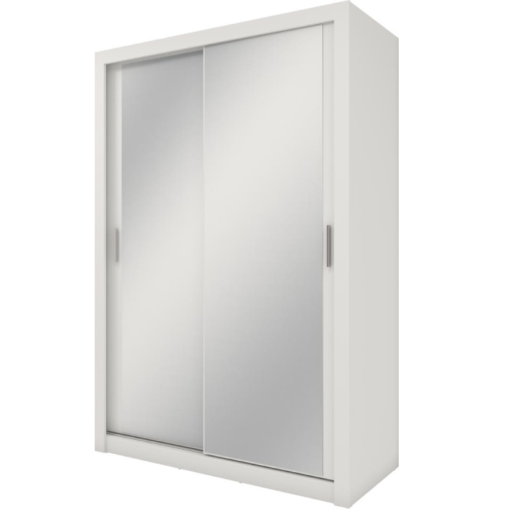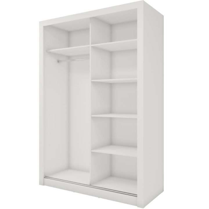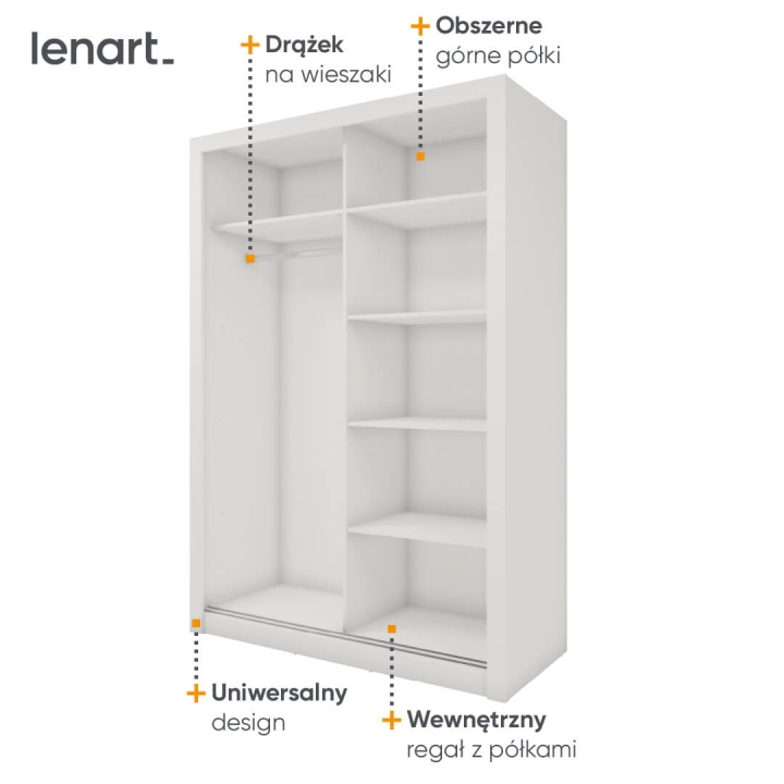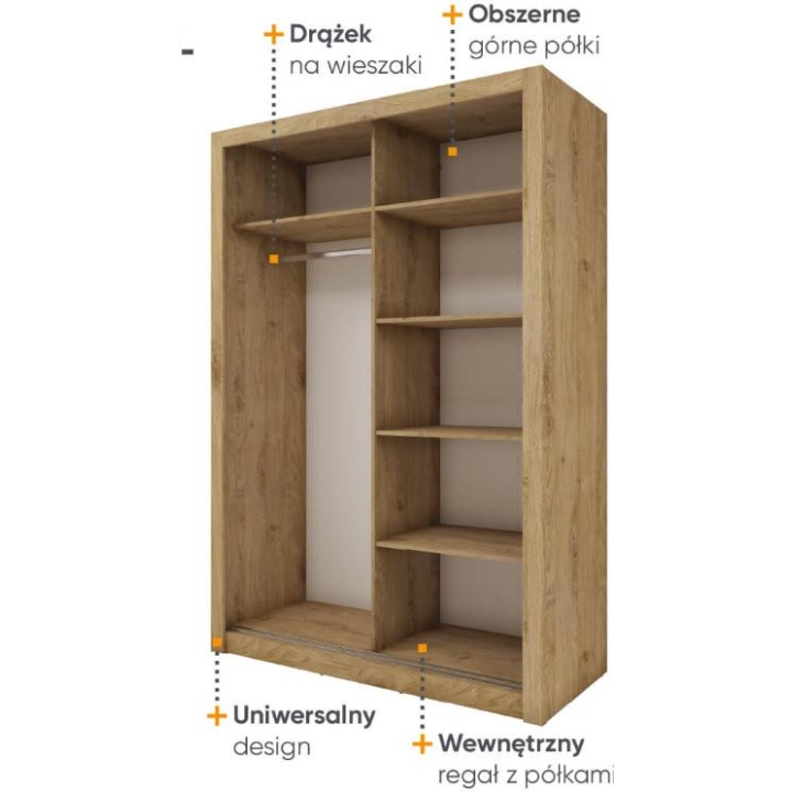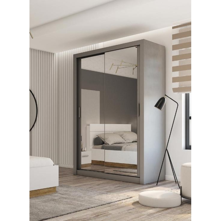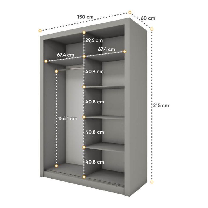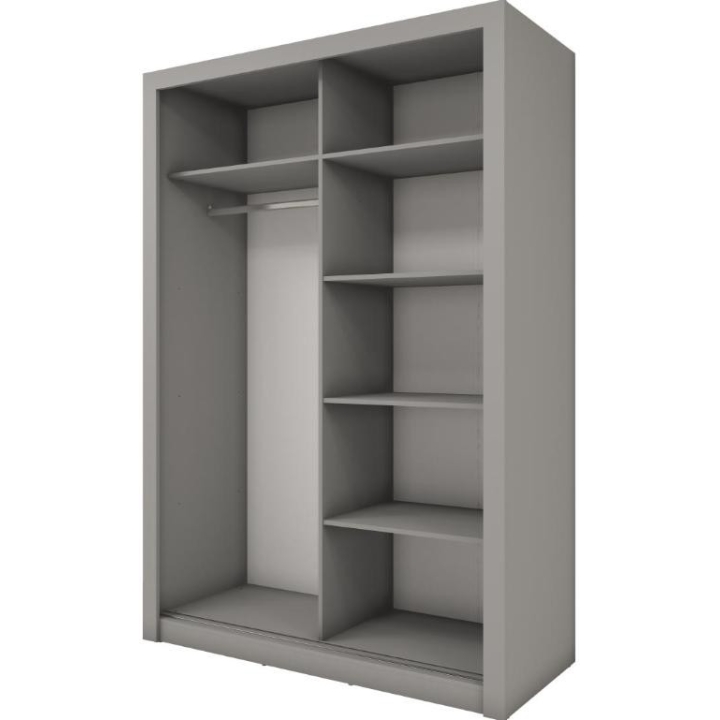 The Idea wardrobe with mirrors on the fronts is the ideal solution for a bedroom, hallway or living room. Its modern design available in 3 colours: grey, white and shetland oak will suit many interiors. The furniture is 150 cm wide, 215 cm high and 63 cm deep. Designed with practicality in mind, it includes a bar and 5 shelves, providing plenty of storage space for clothes and other items. The sliding doors help to save space, while the mirrors add a designer touch and also visually enlarge the interior. The furniture needs to be assembled, but thanks to the simple instructions this will not be a problem. This wardrobe is not only a practical piece of furniture, but also a stylish interior design element that will add elegance and functionality. It is possible to retrofit the wardrobe with LED lighting - LED2SP.