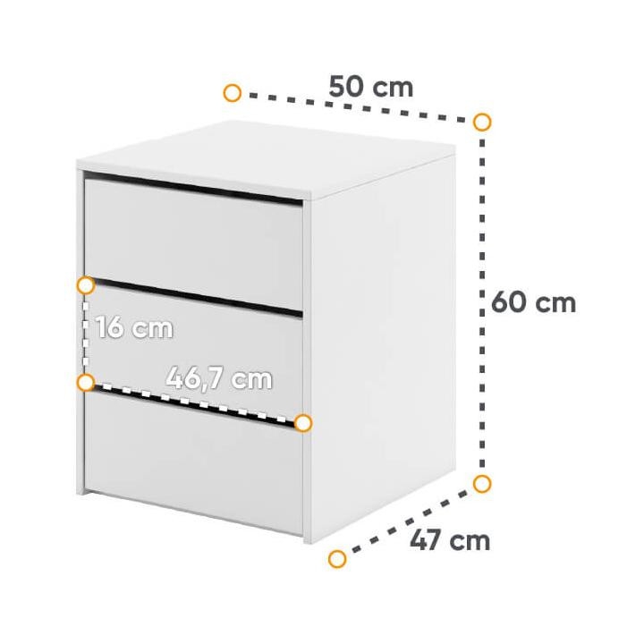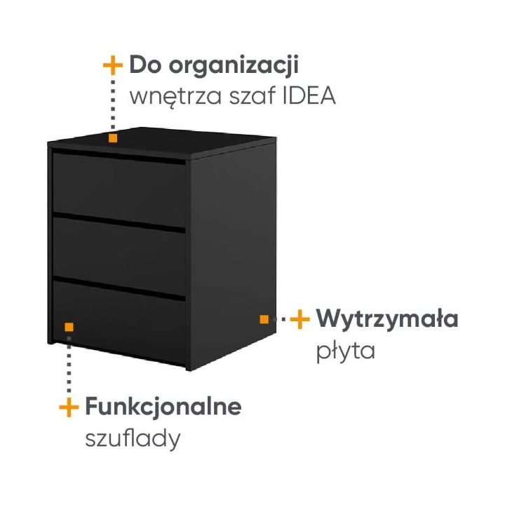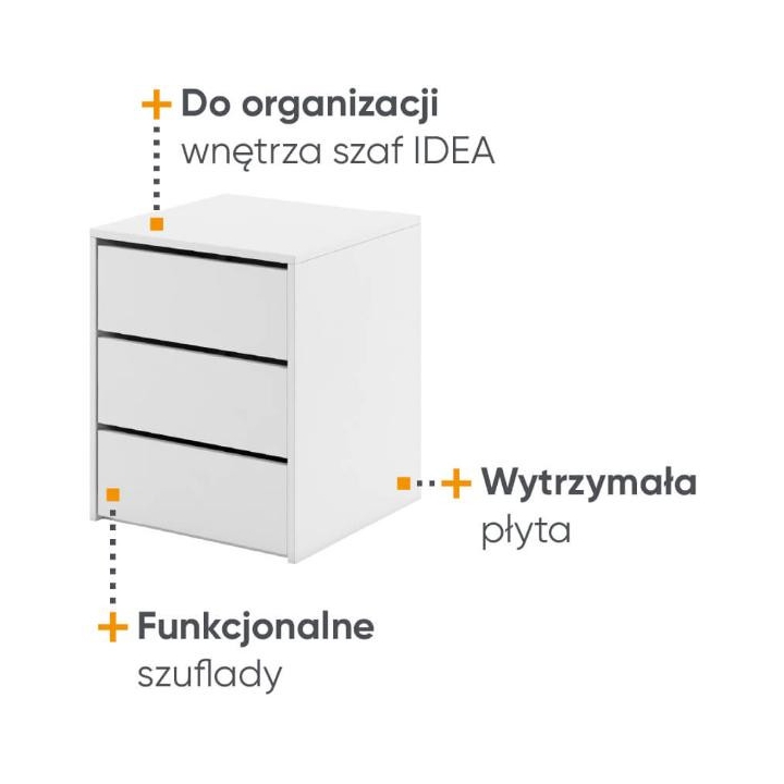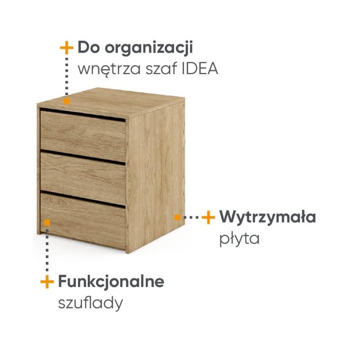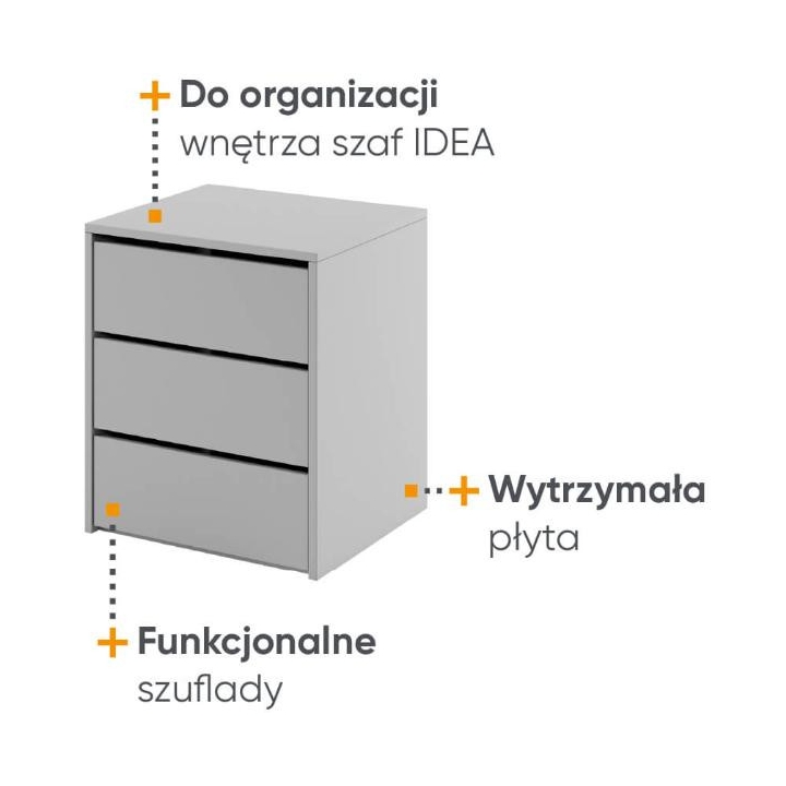 The Idea pedestal is not only a practical storage solution, but also a design element that will give the interior of a wardrobe a modern and elegant character. With a width of 50 cm, a height of 60 cm and a depth of 47 cm, the pedestal is the ideal choice for those who wish to make maximum use of the available space without compromising on aesthetics. The appropriately arranged 3 drawers allow for convenient storage of a variety of accessories. The solid construction ensures durability and satisfaction with use for many years. Available in 4 colours: white, grey, black and shetland oak , this piece of furniture is a universal solution which goes well with other elements of interior design.