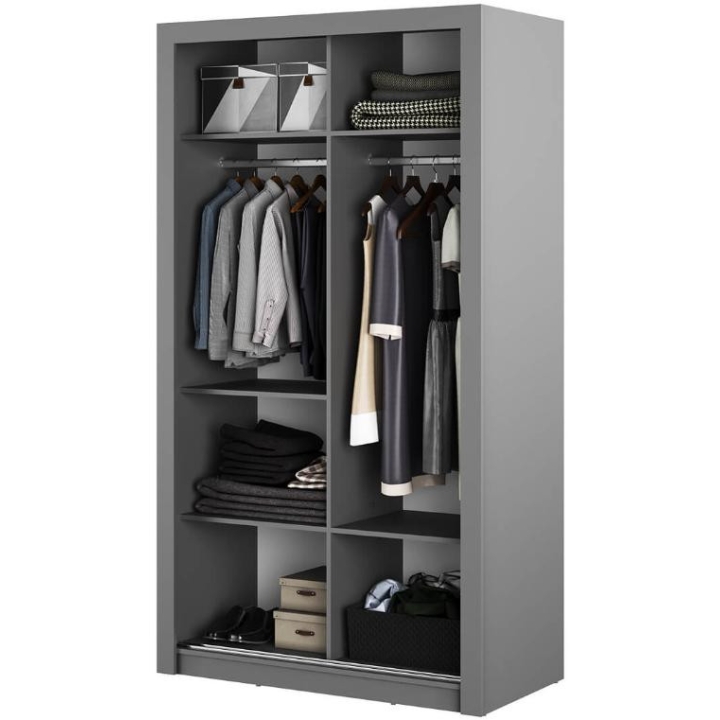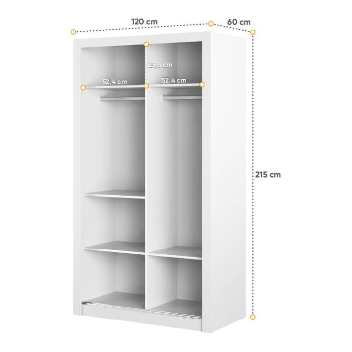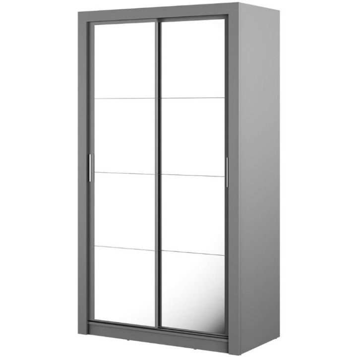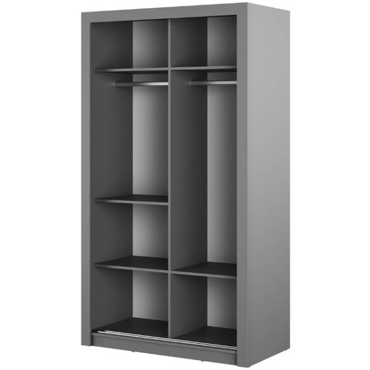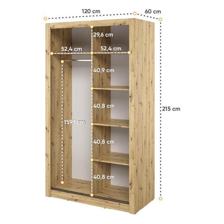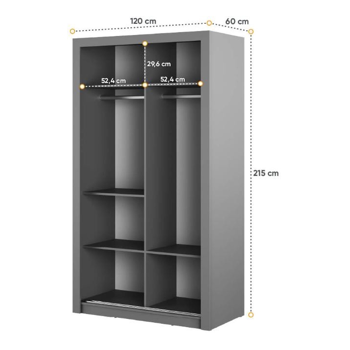 Measuring 120 cm wide, 215 cm high and 60 cm deep, the compact wardrobe with two sliding doors is ideal for smaller rooms such as a bedroom, hallway or youth room. The front features large mirrors that add space and bring more light into the interior. Equipped with two hanger rods to hang clothes of different lengths, and 5 spacious shelves to accommodate all the things you need. The top shelf can be used to store less frequently used clothes, seasonal shoes or other accessories. The wardrobe is available in three colours - white, grey, artisan oak, making it easy to match it with your interior design. It is possible to retrofit the wardrobe with atmospheric LED lighting.