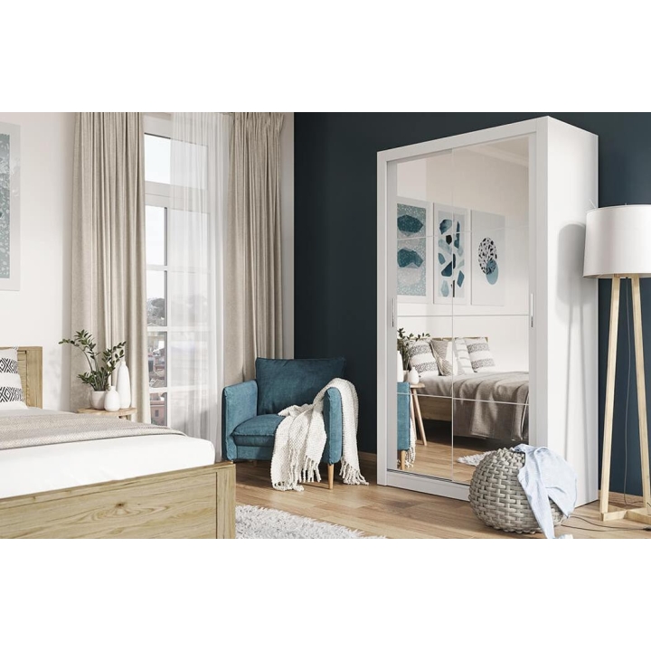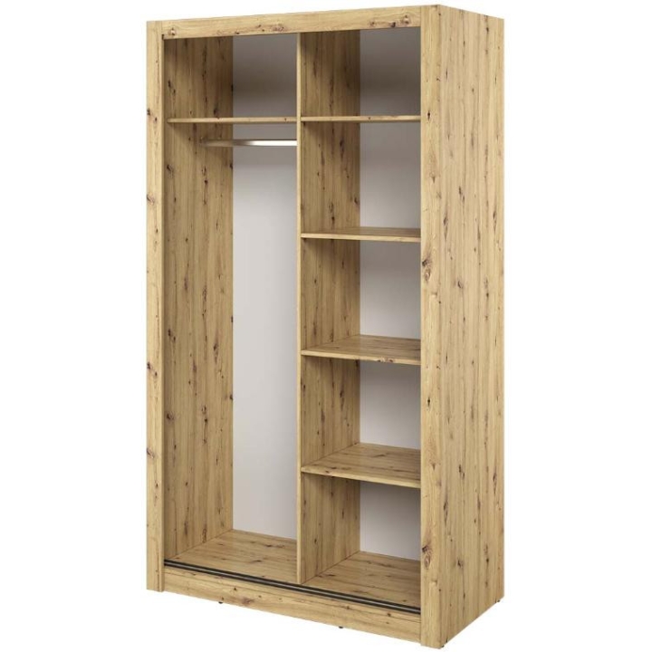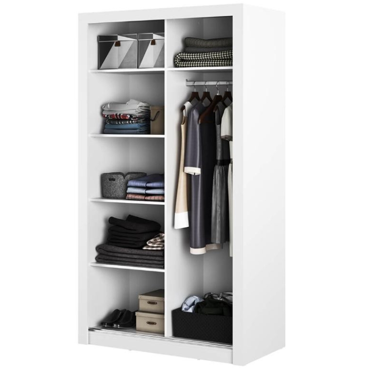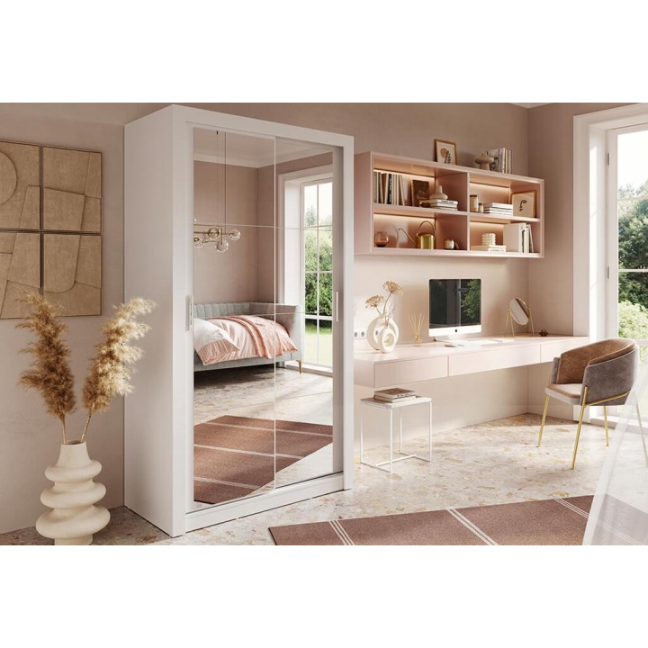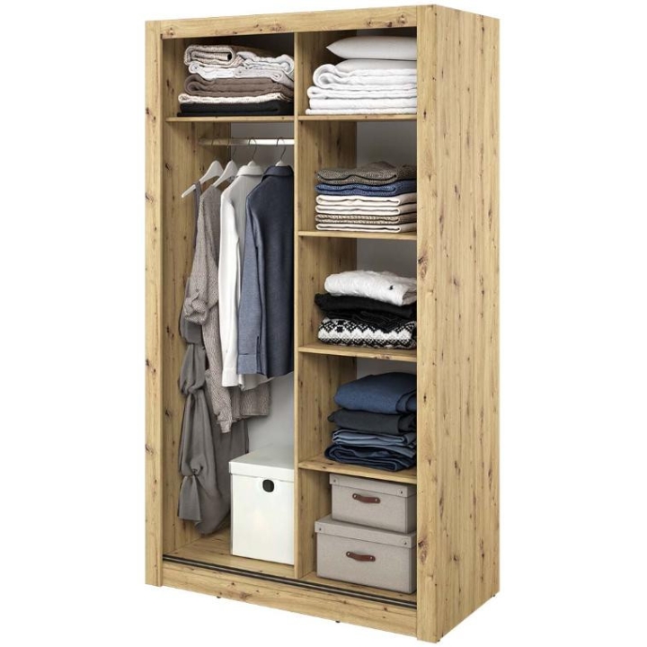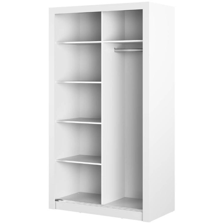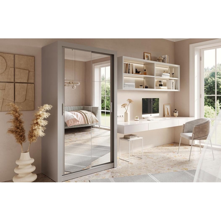 Measuring 120 cm wide, 215 cm high and 60 cm deep, the compact wardrobe with two sliding doors is ideal for smaller rooms such as a bedroom, hallway or youth room. The front features large mirrors that add space and bring more light into the interior. Equipped with two hanger rods to hang clothes of different lengths, and 5 spacious shelves to accommodate all the things you need. The top shelf can be used to store less frequently used clothes, seasonal shoes or other accessories. The wardrobe is available in three colours - white, grey, artisan oak, making it easy to match it with your interior design. It is possible to retrofit the wardrobe with atmospheric LED lighting.