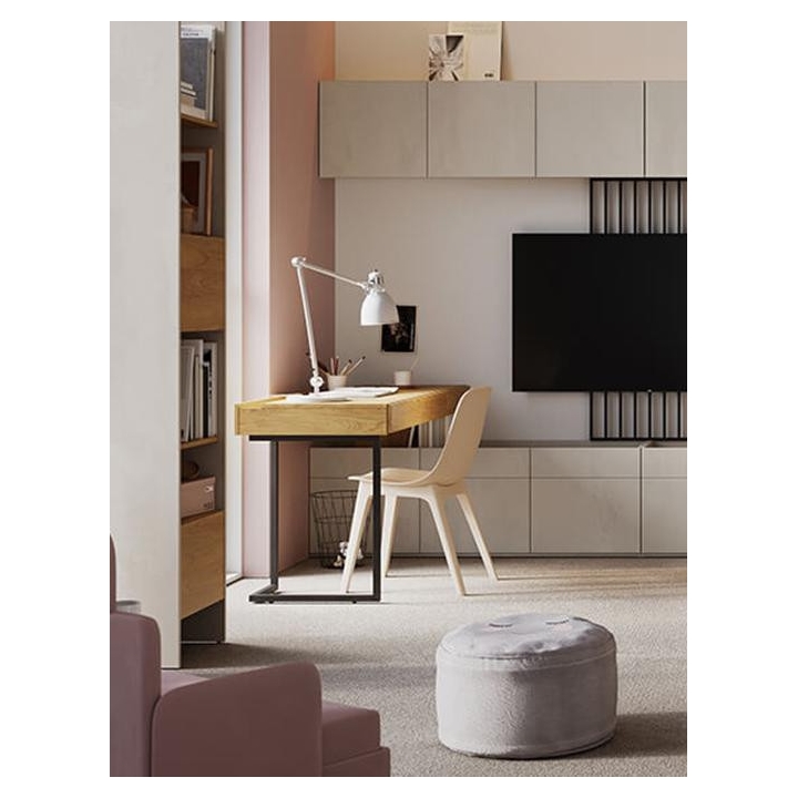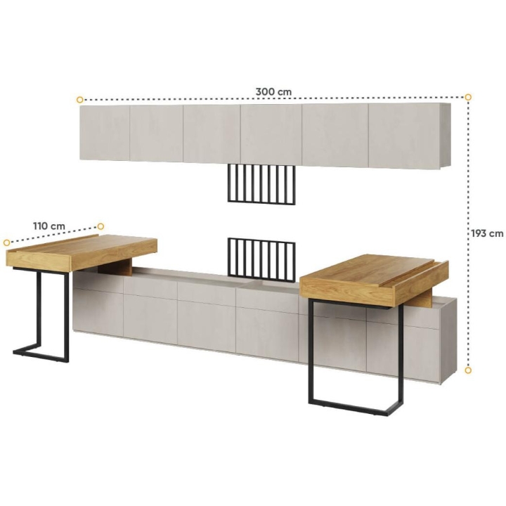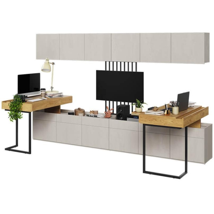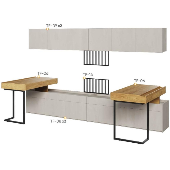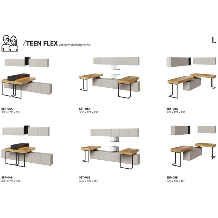 The TEEN FLEX - SET-06 B set is a comprehensive solution for a modern youth room, offering not only functionality but also aesthetic design. The furniture is made of durable laminated board in the elegant colours of silk flou, raw steel and natural hickory and looks exceptionally modern. Their solid construction consists of two solids containing 6 drawers and 12 doors, which provides plenty of space for storing clothes, books or other things. Measuring 300 cm wide, 193 cm high and 110 cm deep, the furniture fits perfectly into a youth room, providing ample space for organisation. Assembly requires a bit of work, but the end result is satisfying. In addition, the set includes 24 shelvesthat add to its functionality, allowing for efficient space management. This comprehensive set, which also includes two desks TF-06, two cabinets TF-08, two wall cabinets TF-09 and a TV panel TF-14, will make furnishing a designer youth room easy and enjoyable.