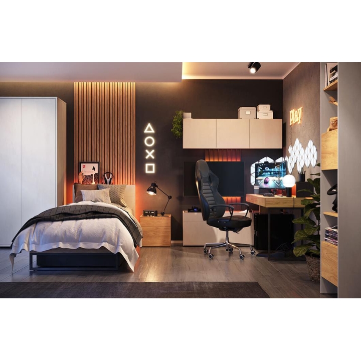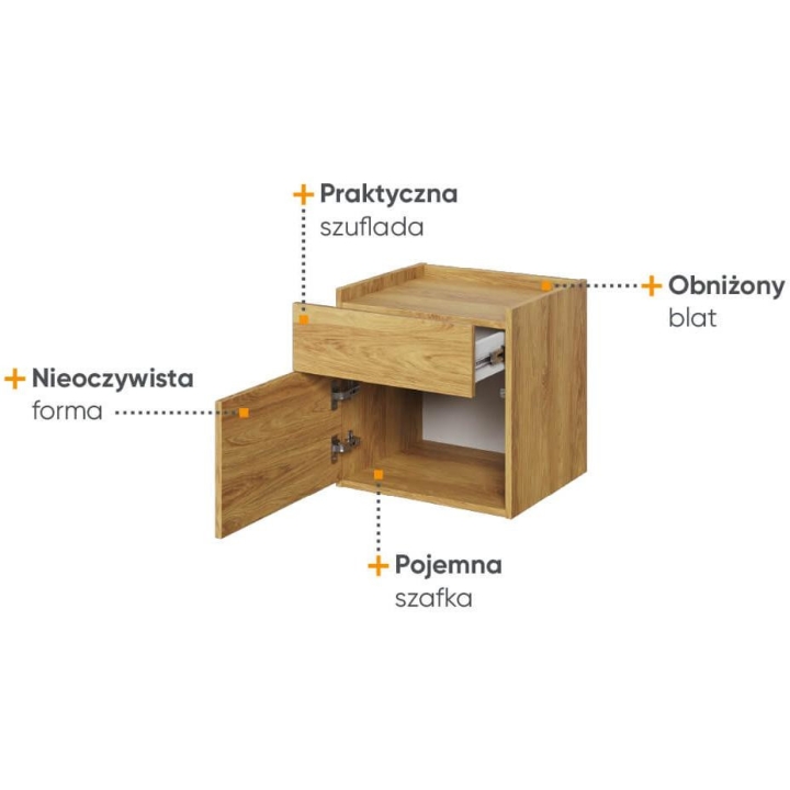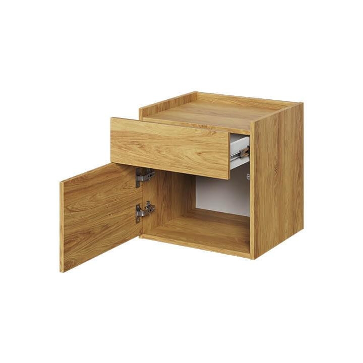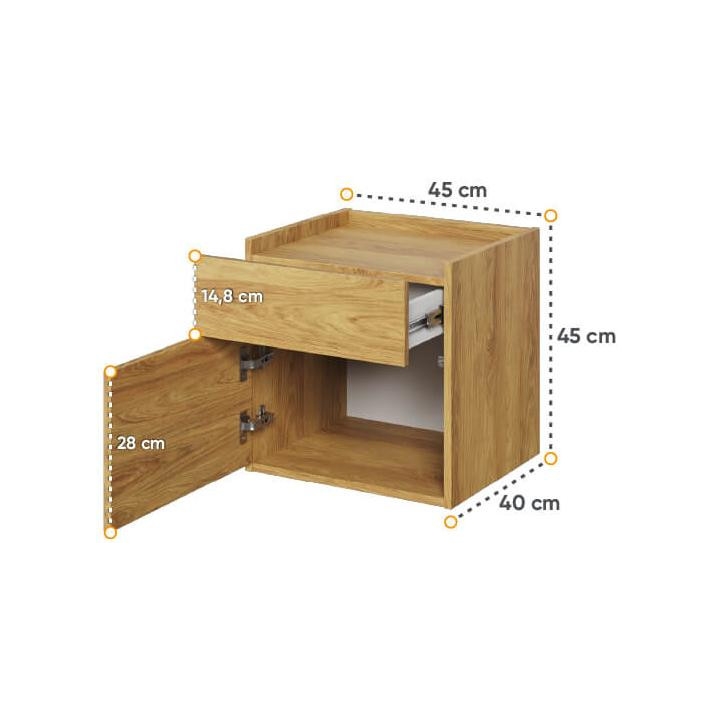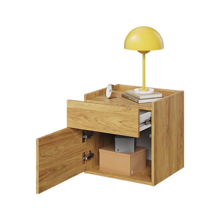 The elegant and stylish Teen Flex bedside table fits perfectly into the modern interiors of teenage rooms. It has a capacious drawer, and a door that provides practical storage space for small items. With a width of 45 cm, a height of 45 cm and a depth of 40 cm, the bedside table is perfect even in small bedroom spaces. The trendy and timeless design of the furniture is based on the natural hickory colour. The characteristic protruding body elements give it a futuristic feel. Its ergonomic top makes it convenient to place a bedside lamp, alarm clock or glass of water. An excellent choice for those who value both functionality and style in their space.
