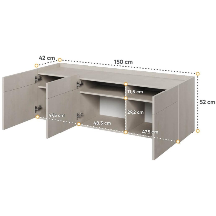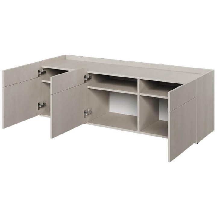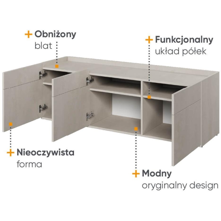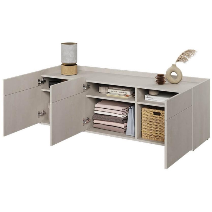 The cabinet from the Teen flex collection is a timeless piece made of durable laminated board in silk flou décor. Its dimensions - 150 cm wide, 52 cm high, 42 cm deep - allow for storage of books, notebooks and other items, making it extremely practical. Assembly requires little effort, but the end result is satisfying. The cabinet blends perfectly with other pieces from the Teen Flex collection, especially when placed under the TV, creating a coherent and functional space. A characteristic element is the handleless fronts, which add an interesting and minimalist style to the cabinet.
