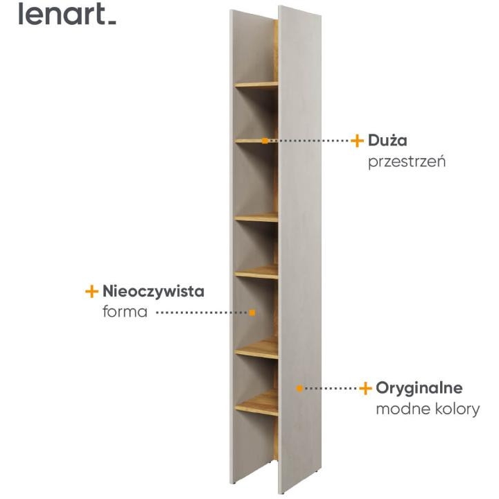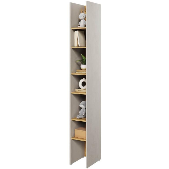 The bookcasefrom the Teen flex collection is a timeless piece made of durable laminated board in natural hickory décor, which enables efficient use of storage space inteenage rooms. Its dimensions - 27 cm wide, 218 cm high, 40 cm deep - allow for storage of books, notebooks and other items, making it extremely practical. Assembly requires little effort, but the end result is satisfying. The bookcase blends perfectly with other pieces from the Teen Flex collection, especially when standing next to a wardrobe, creating a coherent and functional space.