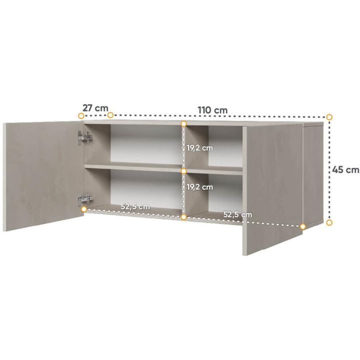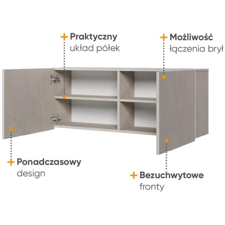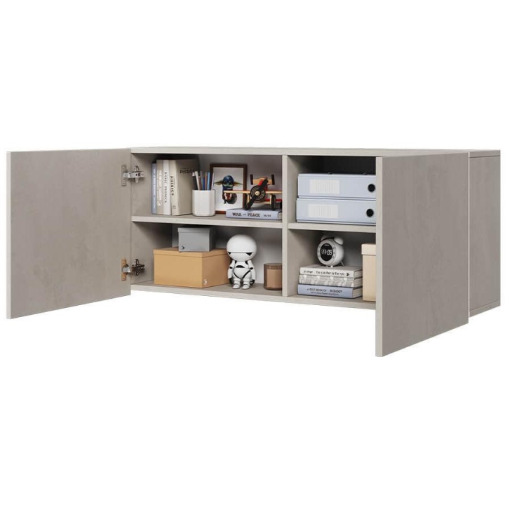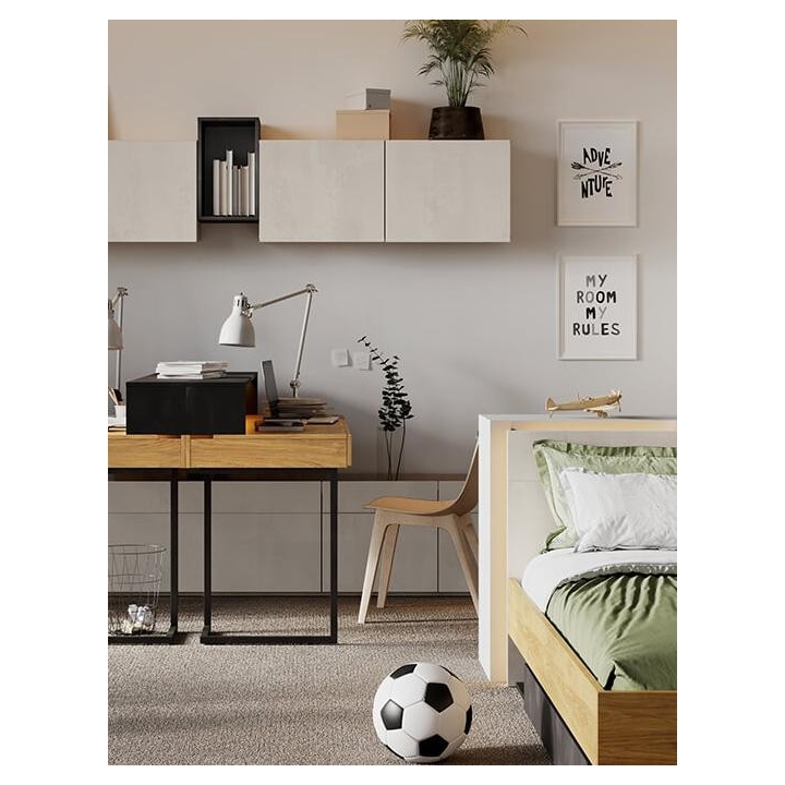 The wallcabinet from the Teen flex collection is a timeless piece made of durable laminated board in silk flou décor, which allows the use of wall space for storage in teenage rooms. Its dimensions - 110 cm wide, 45 cm high, 27 cm deep - allow for storage of books, notebooks and other items, making it extremely practical. Assembly requires little effort, but the end result is satisfying. The cabinet blends perfectly with other pieces from the Teen Flex collection, especially when hung above the desk, creating a coherent and functional space. A characteristic element is the handleless fronts, which add an interesting and minimalist style to the cabinet.