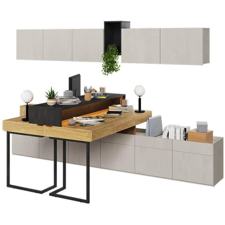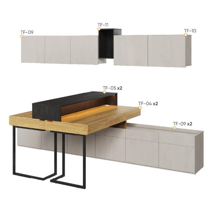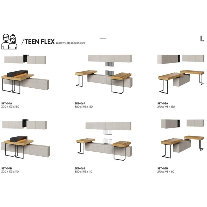 The TEEN FLEX - SET-04 A set is a comprehensive solution for a modern youth room, offering not only functionality but also aesthetic design. The furniture is made of durable laminated board in the elegant colours of silk flou, raw steel and natural hickory, and looks exceptionally modern. Their robust construction includes 6 drawers and 11 doors, providing plenty of space for storing clothes, books or other items. Measuring 300 cm wide, 193 cm high and 150 cm deep, the furniture fits perfectly into a youth room, providing ample space for organisation. Assembly requires a bit of work, but the end result is satisfying. In addition, the set includes 22 shelvesthat add to its functionality, allowing for efficient space management. This comprehensive set, which also includes two desks TF-04, two cabinets TF-08, a wall unit TF-09 and TF-10, two desk extensions TF-05 and a shelf TF-11 , will make furnishing a designer youth room easy and enjoyable.