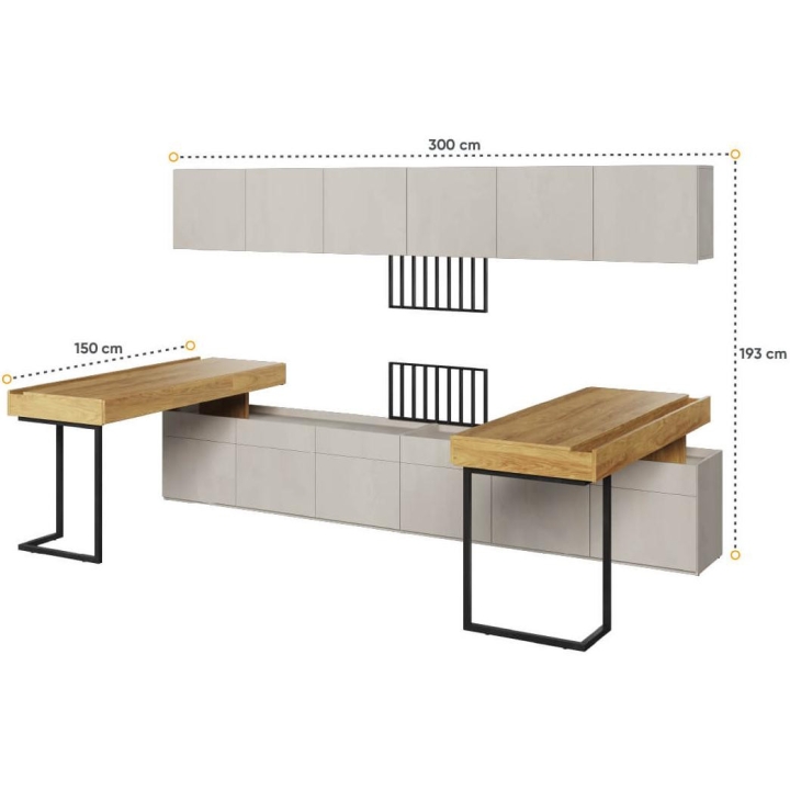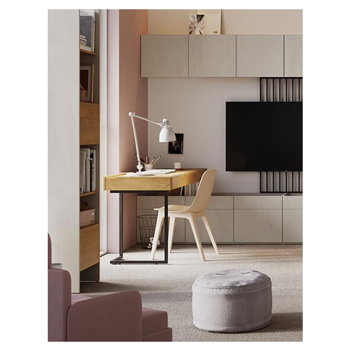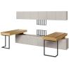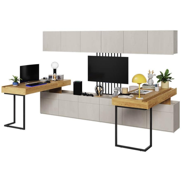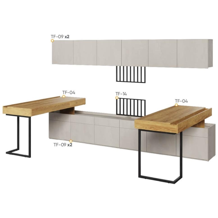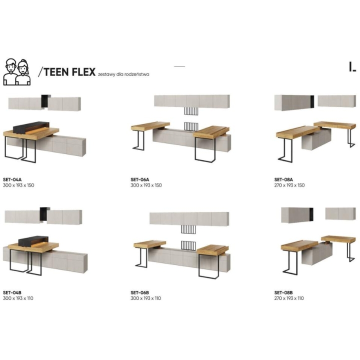 The TEEN FLEX - SET-06 A set is a comprehensive solution for a modern youth room, offering not only functionality but also aesthetic design. The furniture is made of durable laminated board in the elegant colours of silk flou, raw steel and natural hickory and looks exceptionally modern. Their solid construction consists of two solids containing 6 drawers and 12 doors, which provides plenty of space for storing clothes, books or other things. Measuring 300 cm wide, 193 cm high and 150 cm deep, the furniture fits perfectly into a youth room, providing ample space for organisation. Assembly requires a bit of work, but the end result is satisfying. In addition, the set includes 24 shelvesthat add to its functionality, allowing for efficient space management. This comprehensive set, which also includes two desks TF-04, two cabinets TF-08, two wall cabinets TF-09 and a TV panel TF-14, will make furnishing a designer youth room easy and enjoyable.