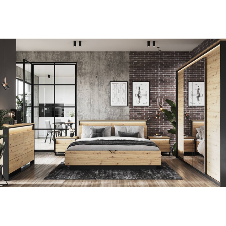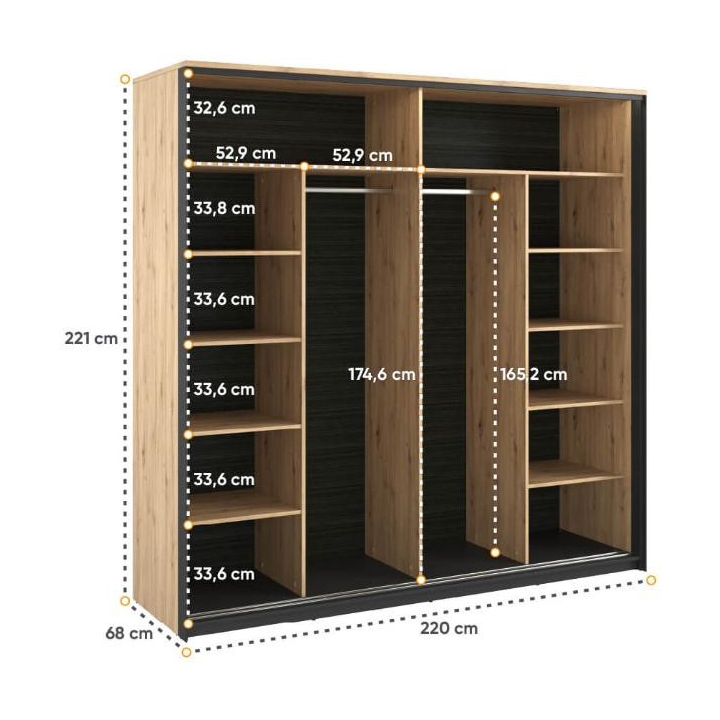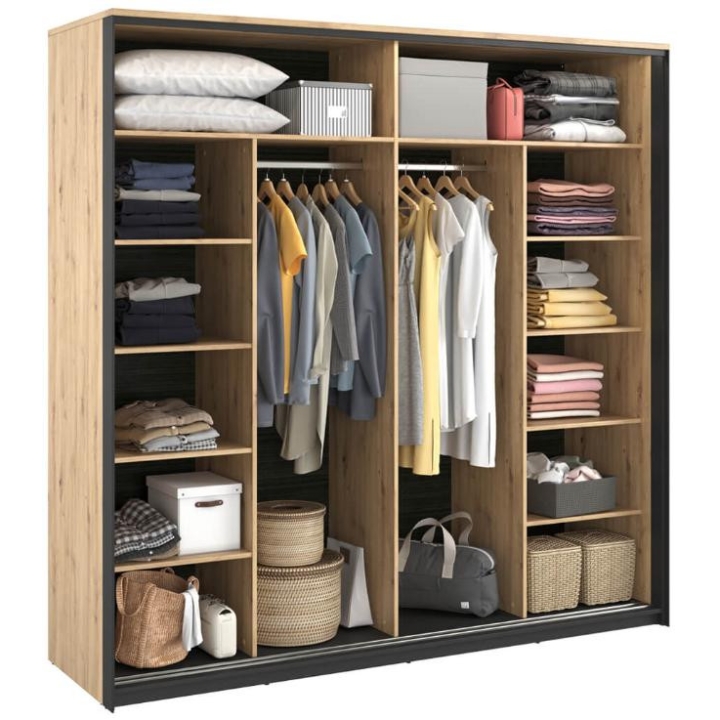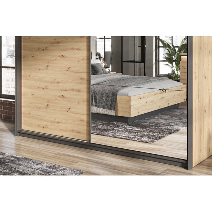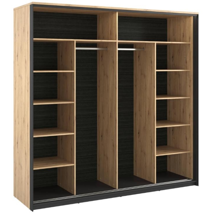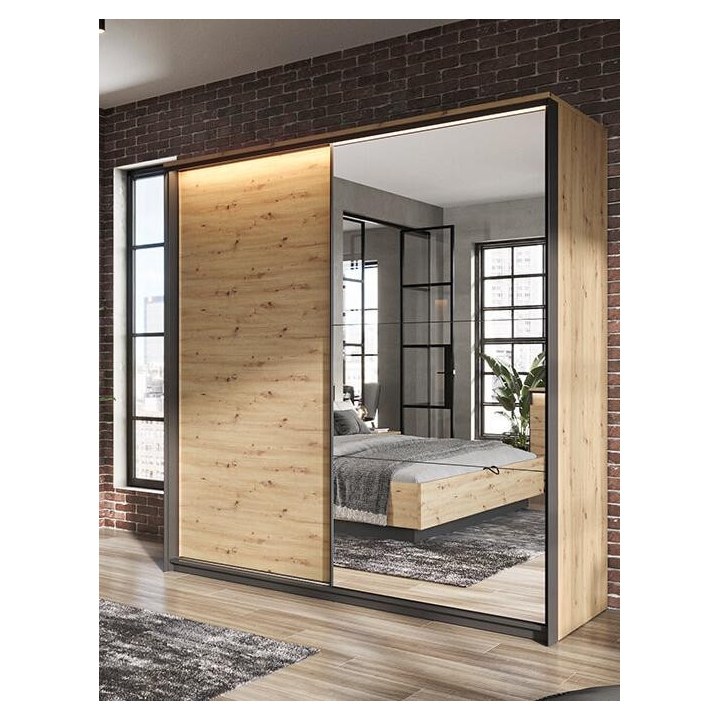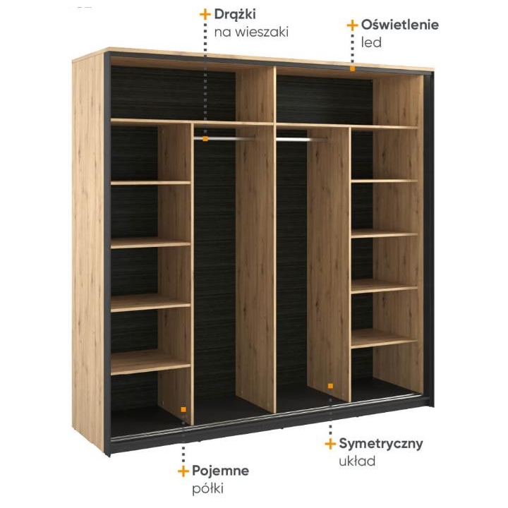 The stylish Quant wardrobe, is a combination of modern style and functionality. Its loft design, held in contrast between the artisan oak décor and the black frame, fits perfectly into the elegant atmosphere of a bedroom, dressing room or even a living room. With two sliding doors, it provides plenty of space and convenience. Inside, there are two hanger rods and ten capacious shelves, as well as led lighting (included), which adds to the elegance. The large mirrored fronts optically enlarge the space, making the room feel more spacious and stylish. Assembling the furniture requires a bit of work, but the end result will certainly satisfy even the most demanding customers looking for a distinctive and functional piece of furniture for their interior.