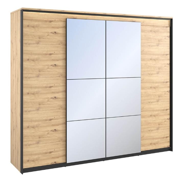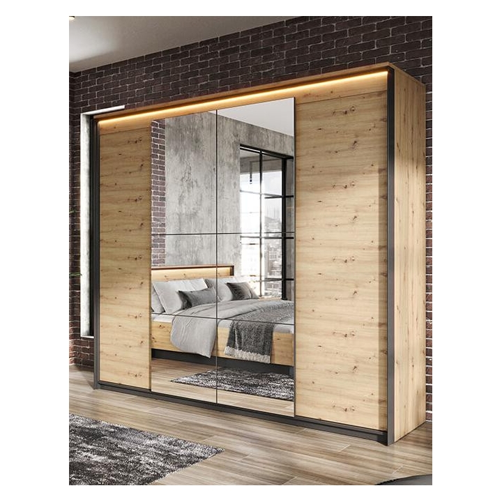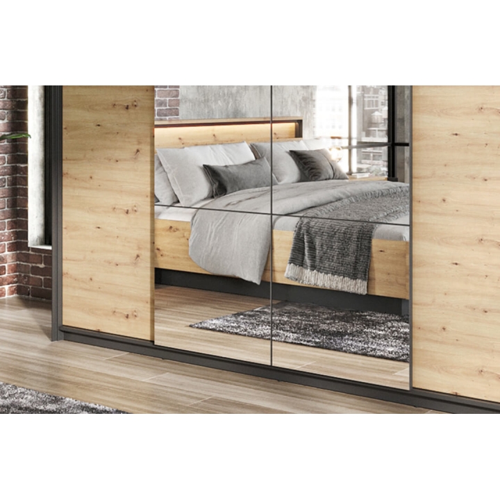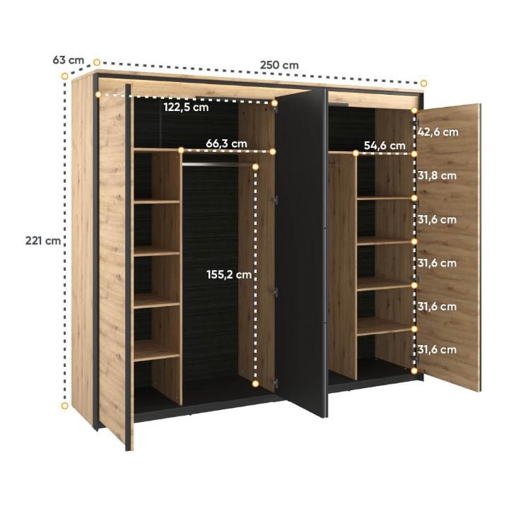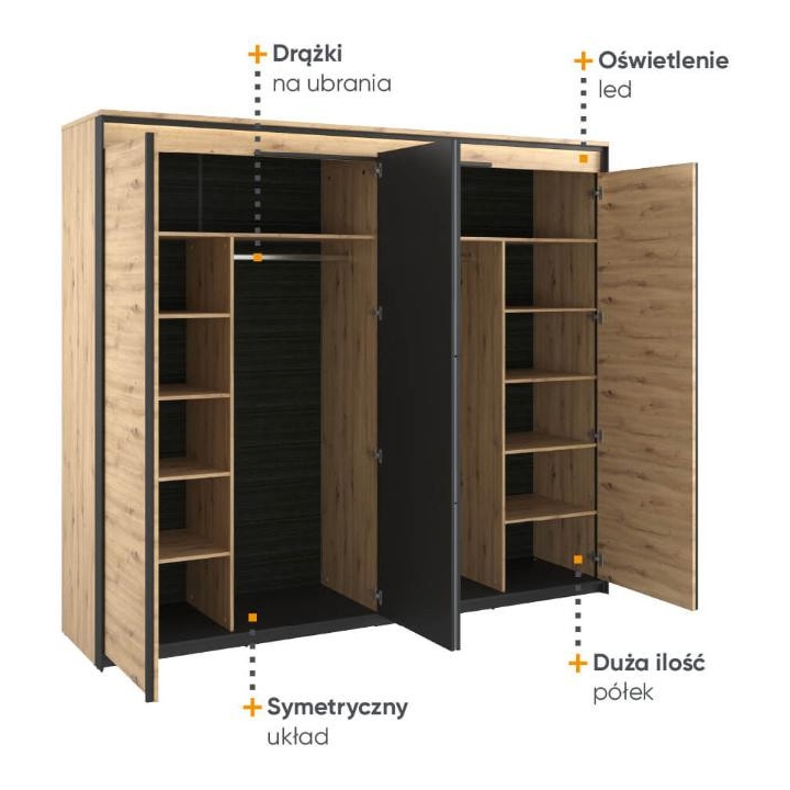 The large, capacious Quant wardrobe with an elegant design is the quintessence of loft style. The furniture measures 250 cm wide, 221 cm high and 63 cm deep. The uniquely planned interior makes it easy to organise - it contains two clothes rails and 5 shelves. Black details contrast with the artisan oak decor, giving the wardrobe a modern look. Mirrored fronts optically enlarge the space, and led lighting (included) adds a unique atmosphere. Furniture from the QUANT collection is a guarantee of style and functionality in the bedroom, wardrobe or living room.