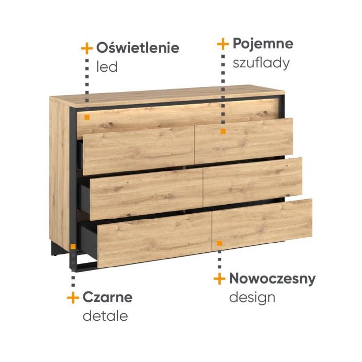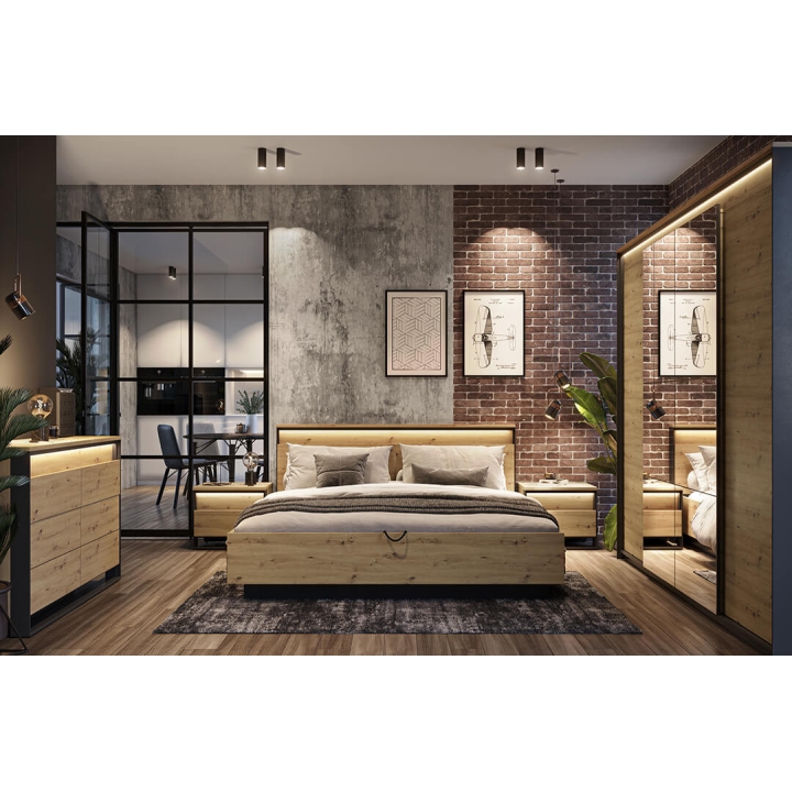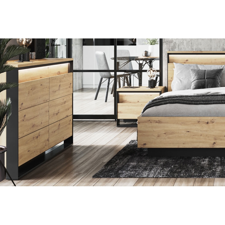 The fashionable and functional Quant chest of drawers, in oak artisan/black, is the ideal solution for a loft-style bedroom. With three very capacious drawers, you can comfortably store documents, clothes or other small items in it. Its dimensions - 133 cm wide, 91 cm high and 41 cm deep - make the chest of drawers fit perfectly into both the bedroom and the living room. The distinctive décor with clear wood grain blends beautifully with the black details, giving the furniture a unique loft character. The three-dimensional design of the fronts and the modern style of the chest of drawers are further emphasised by the led lighting, which is an integral part of the set. Loft bedroom furniture allows not only for functional use of space, but also for creating a unique interior full of character.