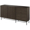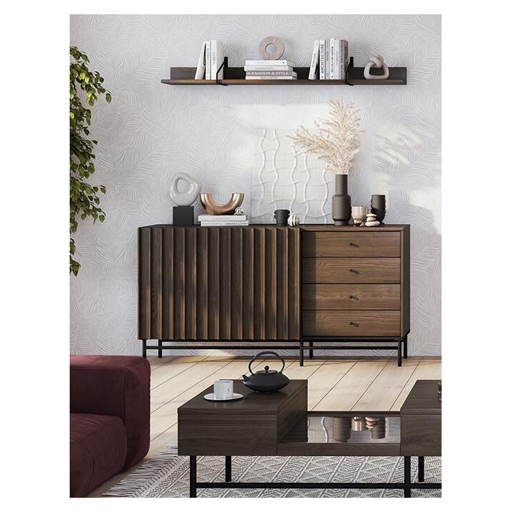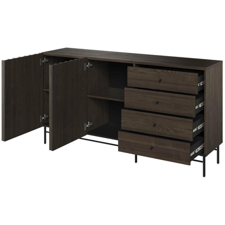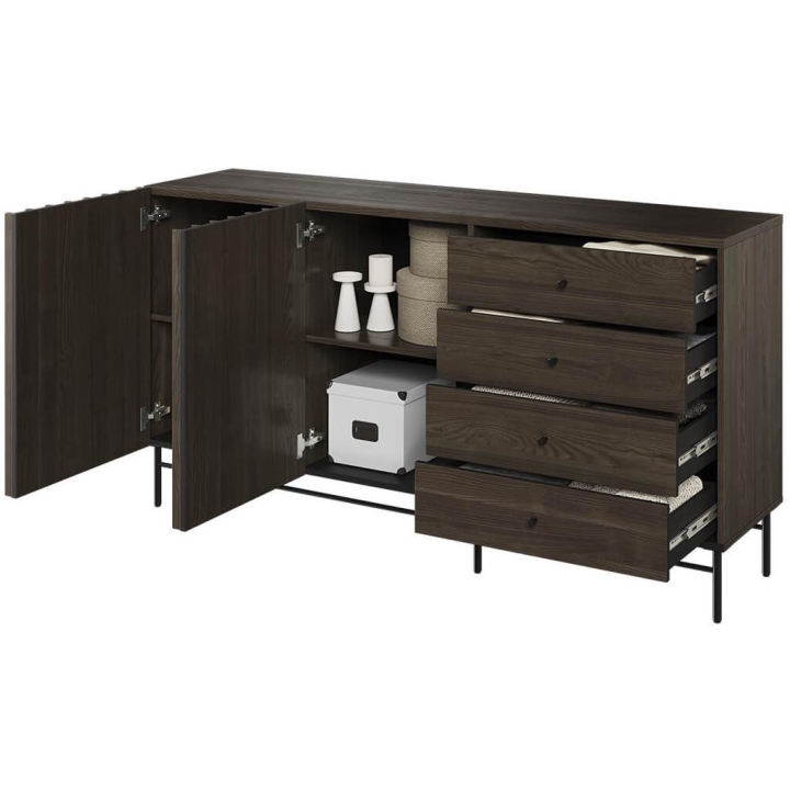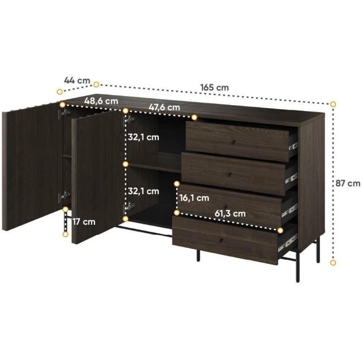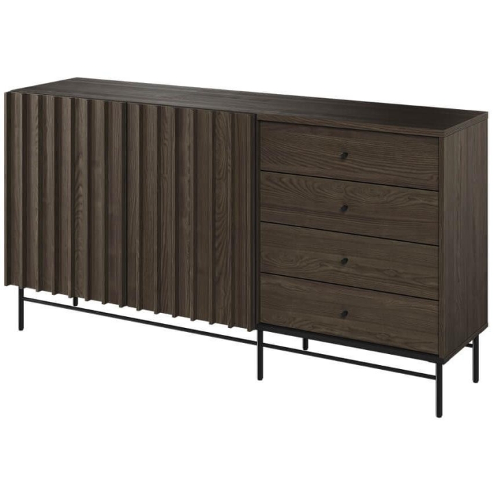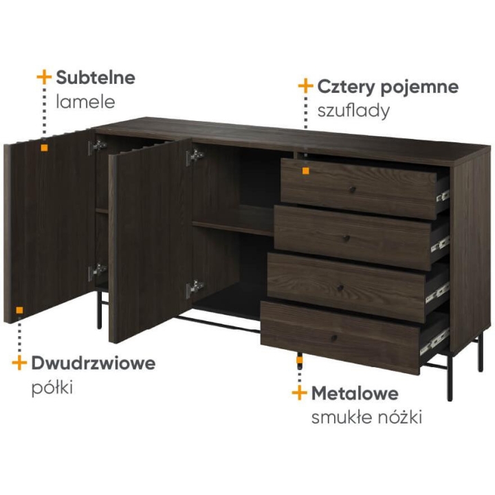 The Piemonte collection chest of drawers is a timeless piece of furniture made of durable laminated board in portland ash décor, which fits perfectly into modern and classic interiors. Its dimensions - 165 cm wide, 87 cm high, 44 cm deep - allow for storage of clothes, bedding and other items, making it extremely practical. The chest of drawers, with slender metal legs, is equipped with four drawers and spacious shelves. Assembly requires little effort and the end result is satisfying. The chest of drawers fits perfectly with other pieces from the Piemonte collection, especially the table, creating a coherent and functional space. A characteristic element is the fluted front, which adds an interesting and minimalist style to the chest of drawers.