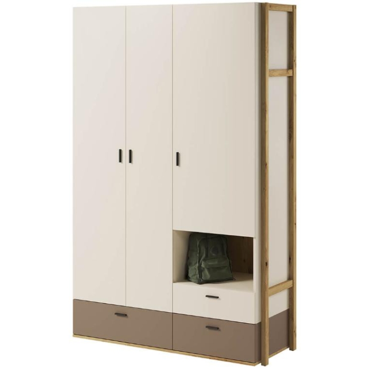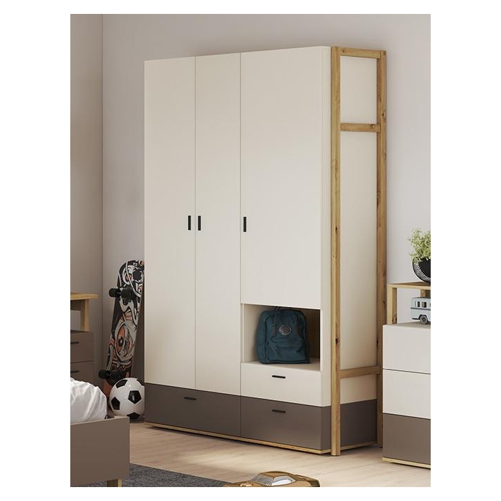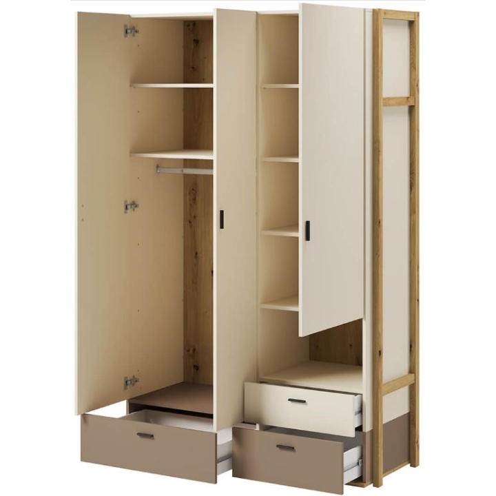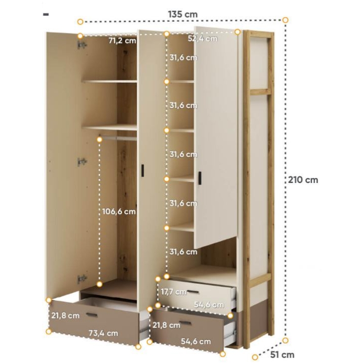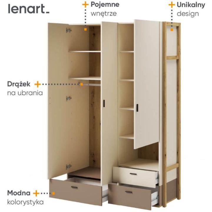 The wardrobe from the Lenny collection is a timeless piece of furniture made of durable laminated board in oak artisan, beige and truffle decors, which fits perfectly into modern and classic interiors. Its dimensions - 135 cm wide, 210 cm high, 51 cm deep - allow for storage of clothes, bedding and other items, making it extremely practical. The wardrobe is equipped with 3 capacious drawers, shelves and a bar. Assembly requires little effort and the end result is satisfactory. The wardrobe blends perfectly with other pieces from the Lenny collection, especially with the chest of drawers, creating a coherent and functional space. A characteristic element is the side wall, which adds an interesting and minimalist style to the wardrobe.