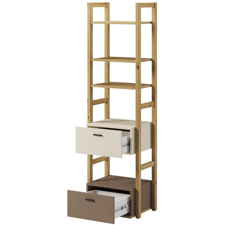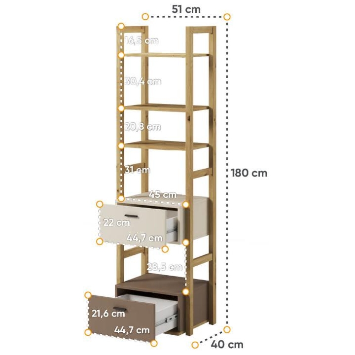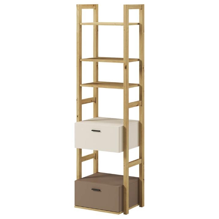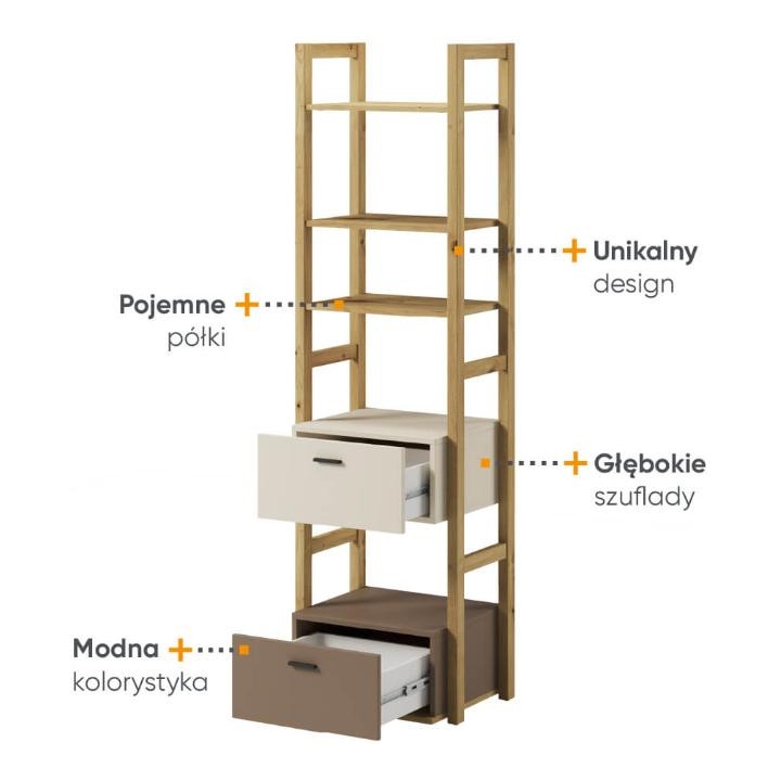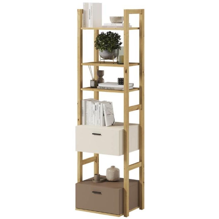 The bookcasefrom the Lenny collection is a timeless piece of furniture made of durable laminated board in oak artisan, beige and truffle decors, which fits perfectly into modern and classic interiors. Its dimensions - 51 cm wide, 180 cm high, 40 cm deep - allow for storage of books, decorations and other items, making it extremely practical. The bookcase is equipped with 2 capacious drawers. Assembly requires little effort and the end result is satisfying. The bookcase perfectly matches other pieces from the Lenny collection, especially the chest of drawers, creating a coherent and functional space. A characteristic element is the body, which adds an interesting and minimalist style to the bookcase.