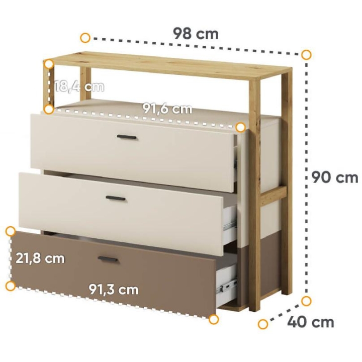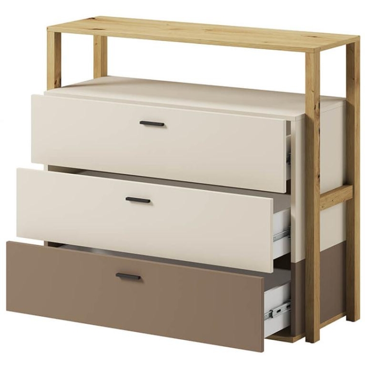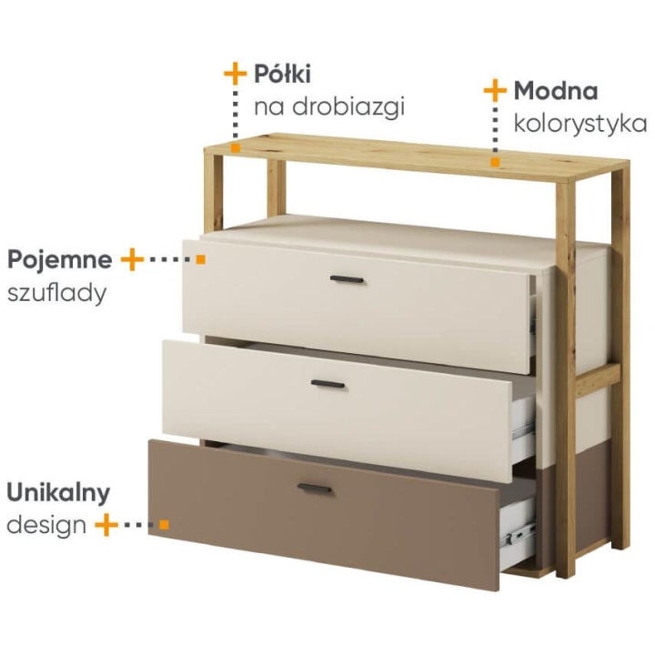 The Lenny collection chest of drawers is a timeless piece of furniture made of durable laminated board in oak artisan and beige decors, which fits perfectly into modern and classic interiors. Its dimensions - 98 cm wide, 90 cm high, 40 cm deep - allow for storage of clothes, bedding and other items, making it extremely practical. The chest of drawers is equipped with a niche and 3 capacious drawers. Assembly requires little effort and the end result is satisfying. The chest goes well with other pieces from the Lenny collection, especially with the wardrobe, creating a coherent and functional space. A characteristic element is the cabinet, which adds an interesting and minimalist style to the chest.