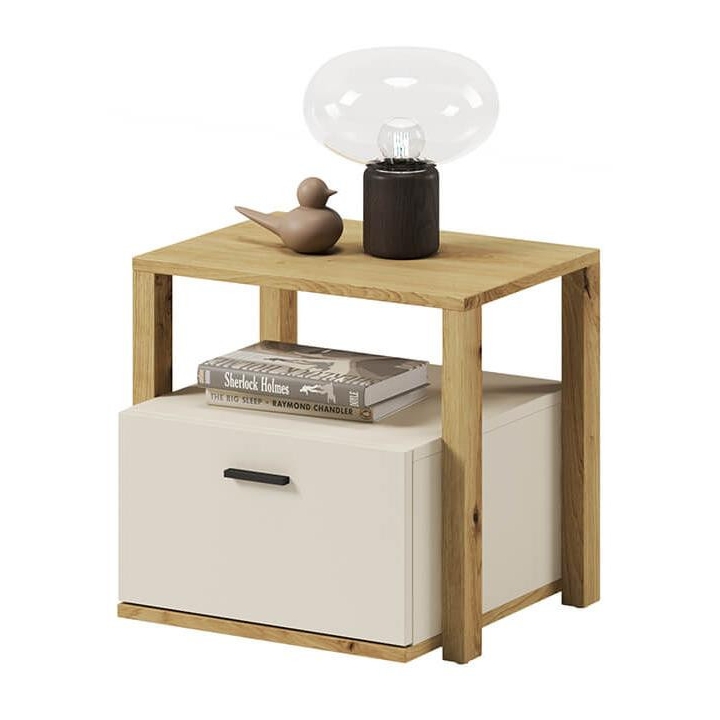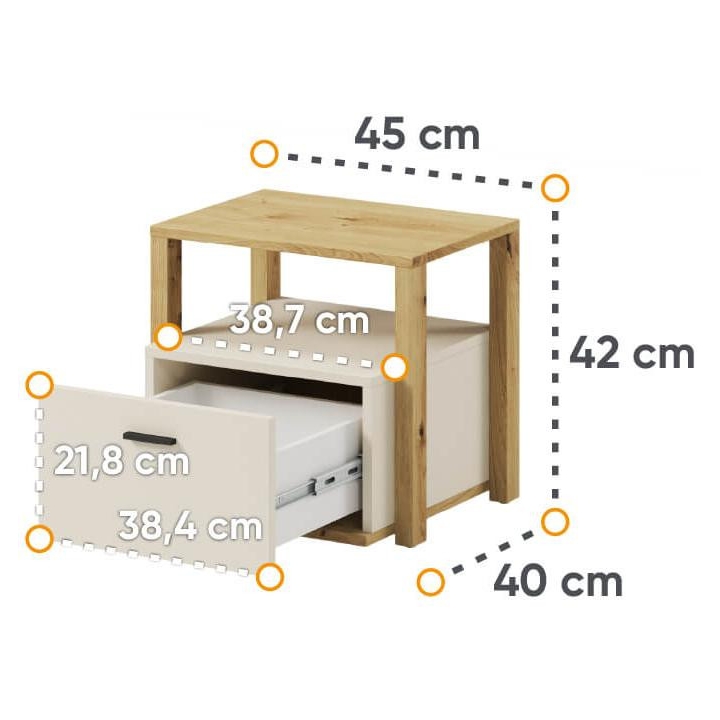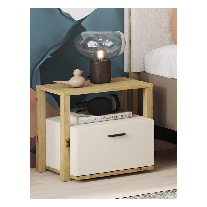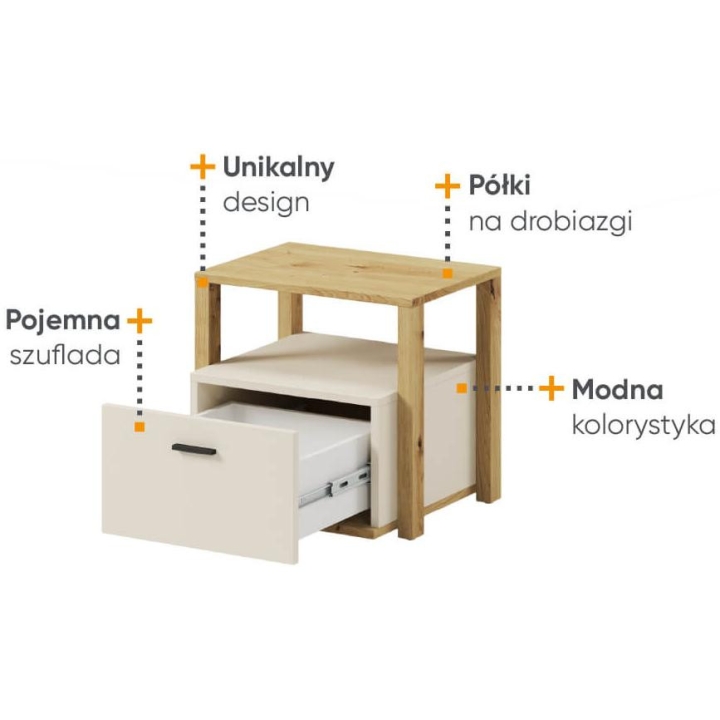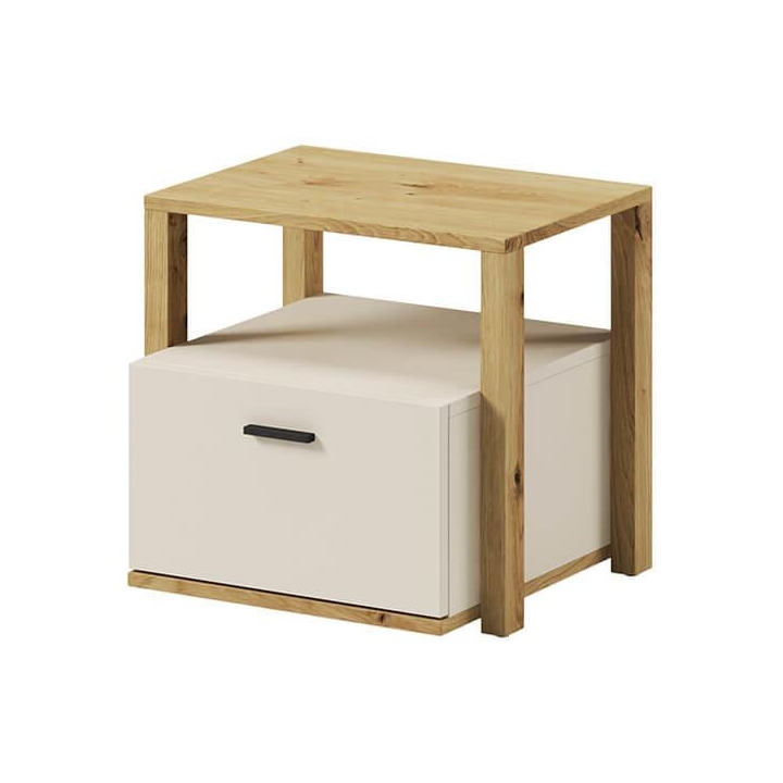 The bedside table from the Lenny collection is a timeless piece of furniture made of durable laminated board in artisan oak and beige decors, which fits perfectly into modern and classic interiors. Its dimensions - 45 cm wide, 42 cm high, 40 cm deep - allow for storage of books, decorations and other items, making it extremely practical. The table is equipped with a recess and a capacious drawer. Assembly requires little effort and the end result is satisfying. The table blends perfectly with other pieces from the Lenny collection, especially with the bed, creating a coherent and functional space. A characteristic element is the body, which adds an interesting and minimalist style to the table.