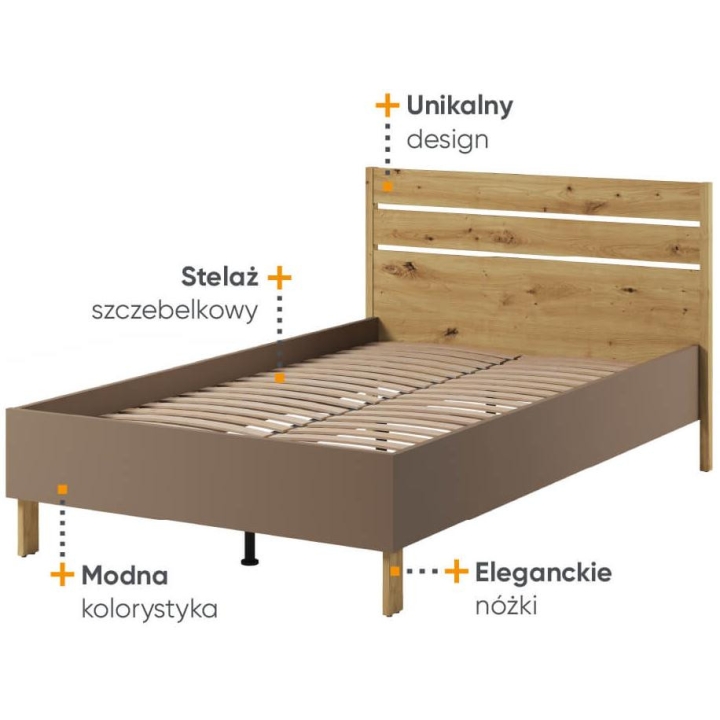 The single bed from the Lenny collection is a harmonious combination of modern design and functionality. Made of durable laminated board in the colour of oak artisan, with subtle accents of beige and a shade of truffle, it looks stylish and elegant. Its dimensions - 132 cm wide, 96 cm high and 207 cm deep - make it ideal for youth rooms while taking up little space. The high headrest is an added bonus, and the option to add the LY-09 upholstered headrest will allow for comfortable evenings spent watching movies or reading books. Assembly requires some work, but the end result is well worth it. This is an ideal solution for young people, creating a fashionable and functional interior that is sure to win the approval of both girls and boys. Bed sold without mattress.
