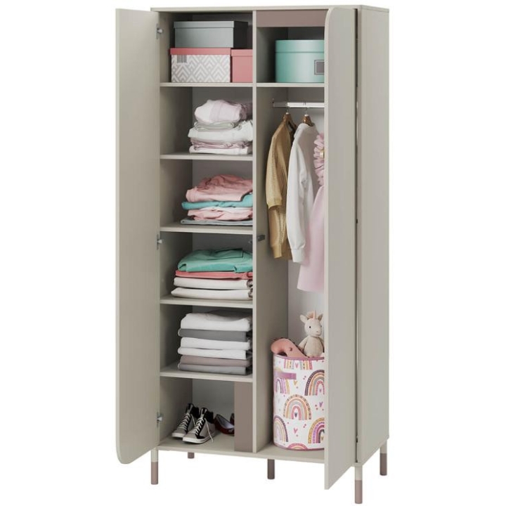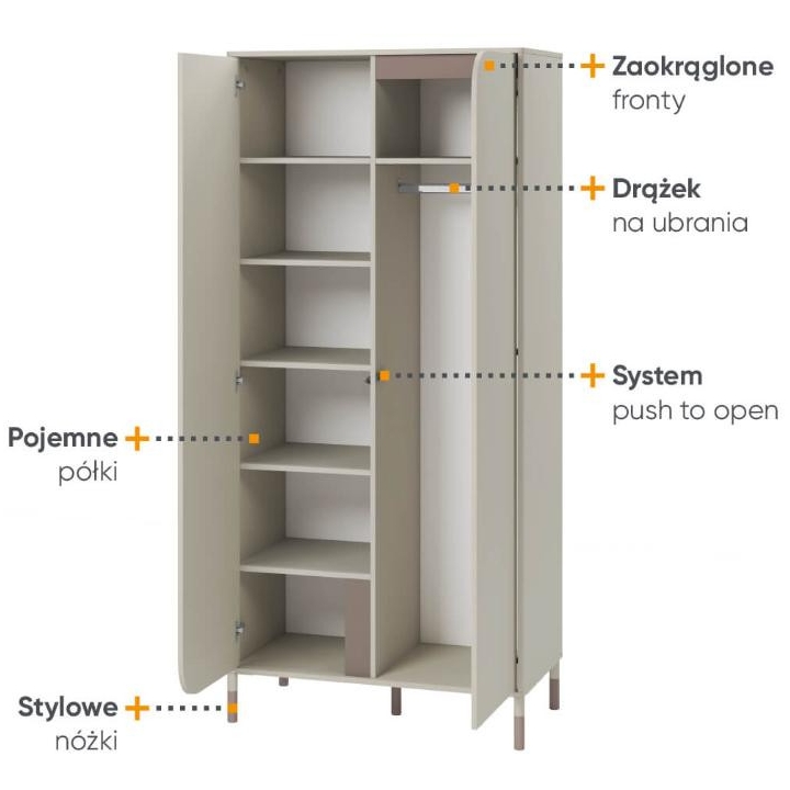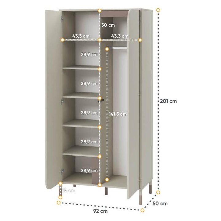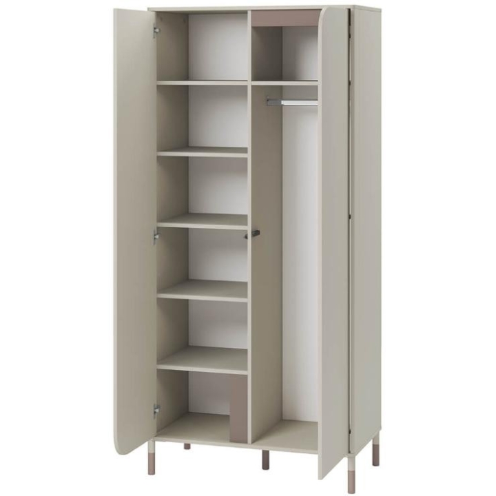 The wardrobe from the Harmony collection is a timeless piece of furniture made of durable laminated board in oak artisan, beige and truffle decors, which fits perfectly into modern and classic interiors. Its dimensions - 92 cm wide, 201 cm high, 50 cm deep - allow for storage of clothes, bedding and other items, making it extremely practical. The wardrobe is equipped with 8 shelves and a bar. Assembly requires little effort and the end result is satisfactory. The wardrobe blends perfectly with other pieces from the Harmony collection, especially with the chest of drawers, creating a coherent and functional space. Characteristic elements are the fronts, which add an interesting and minimalist style to the wardrobe.