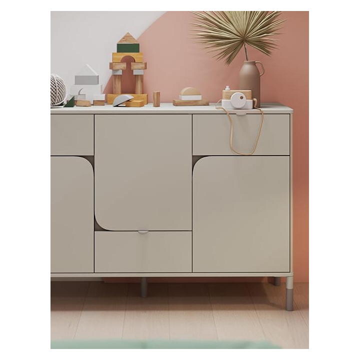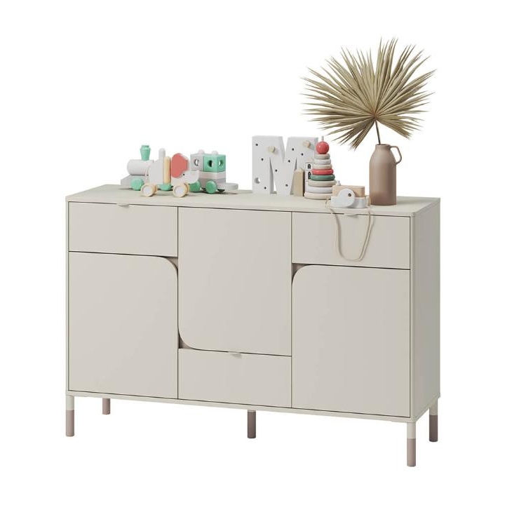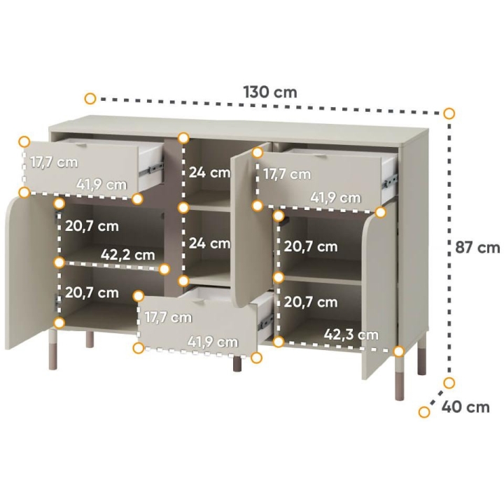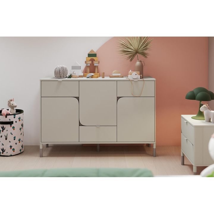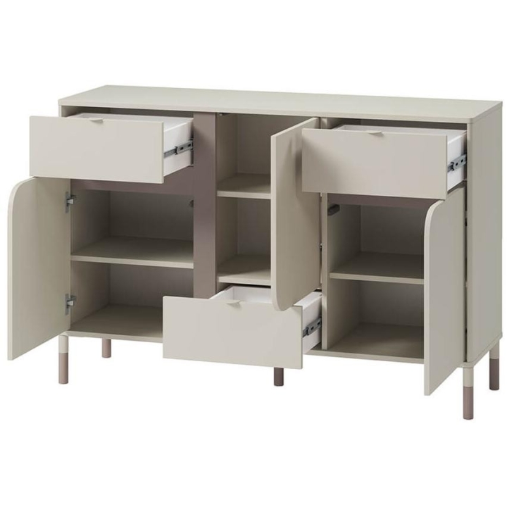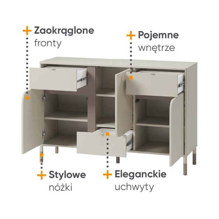 The Harmony collection chest of drawers is a timeless piece of furniture made of durable laminated board in cashmere and truffle decors, which fits perfectly into modern and classic interiors. Its dimensions - 130 cm wide, 87 cm high, 40 cm deep - allow for storage of clothes, bedding and other items, making it extremely practical. The chest of drawers is equipped with a niche and 3 capacious drawers. Assembly requires little effort and the end result is satisfying. The chest of drawers goes well with other pieces from the Harmony collection, especially with the wardrobe, creating a coherent and functional space. A characteristic element are the fronts, which add an interesting and minimalist style to the chest of drawers.