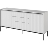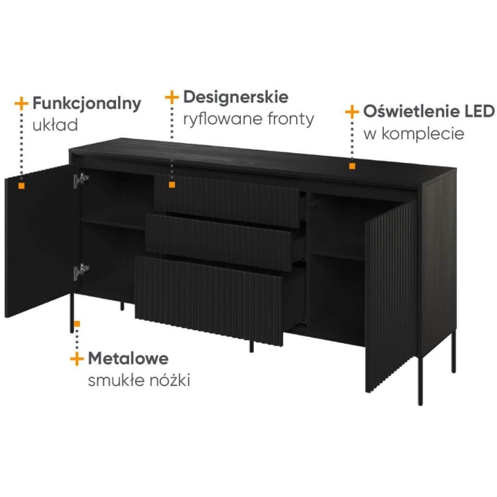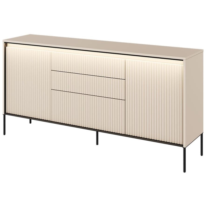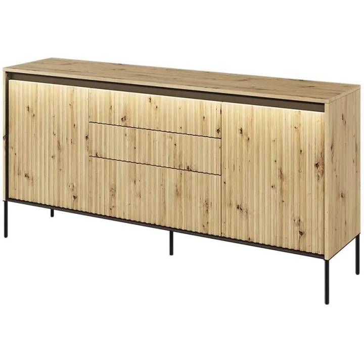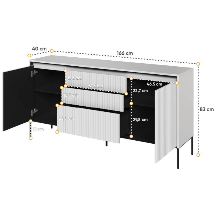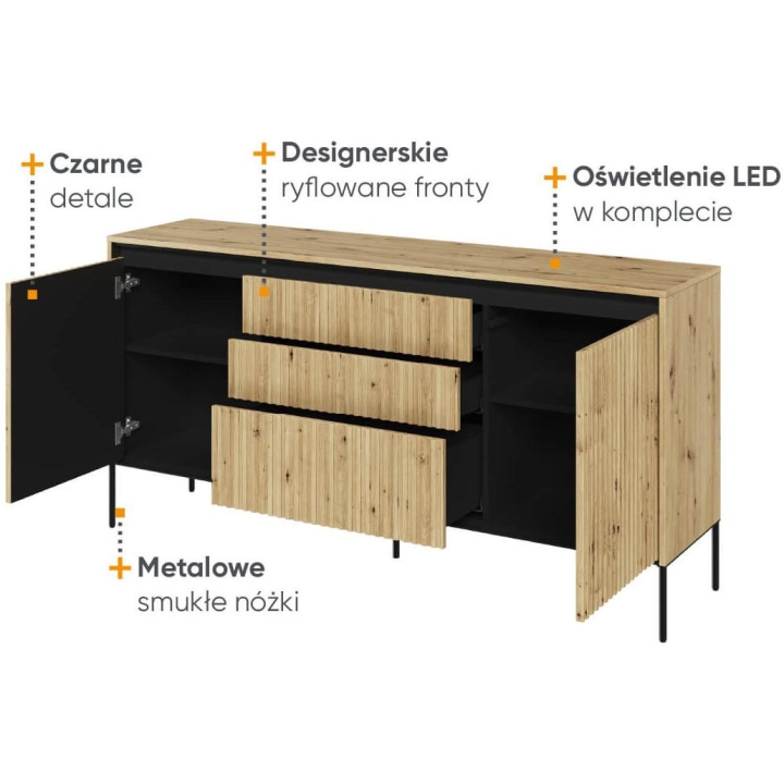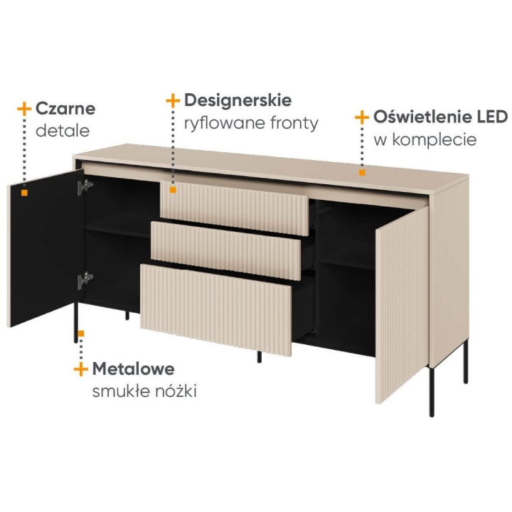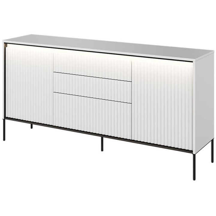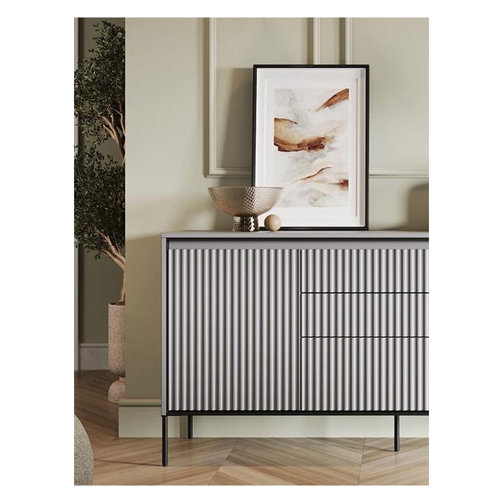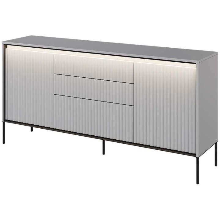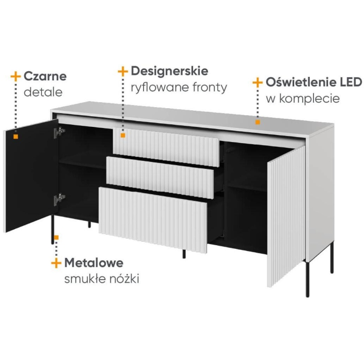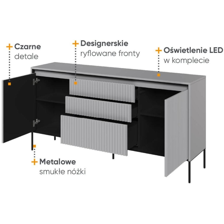 The Trend collection chest of drawers is a timeless piece of furniture made from durable laminated board in five decors - white, sand beige, black, artisan oak and grey. This unique piece of furniture, which has LED lighting included, will fit perfectly into modern and classic interiors. Its dimensions - 166 cm wide, 83 cm high, 40 cm deep - allow for storage of clothes, decorations, bedding and other items, making it extremely practical. The chest of drawers - two doors with 3 drawers - is the perfect piece of furniture for displaying your collectables. Assembly requires little effort and the end result is satisfying. The chest of drawers blends perfectly with other pieces from the Trend collection, especially with the display cabinets, creating a coherent and functional space. Characteristic elements are the fluted fronts, which add an interesting and unique style to the cabinet. Equipped with a push to open system.