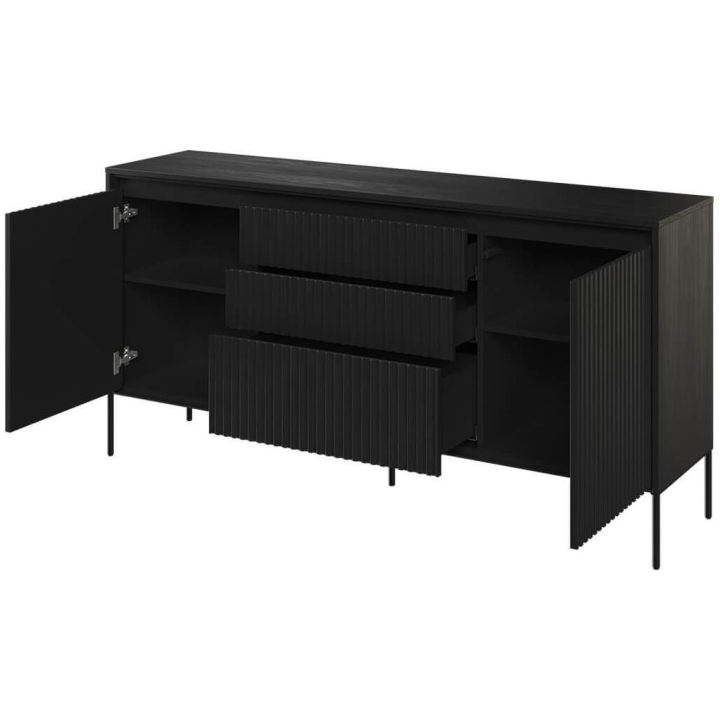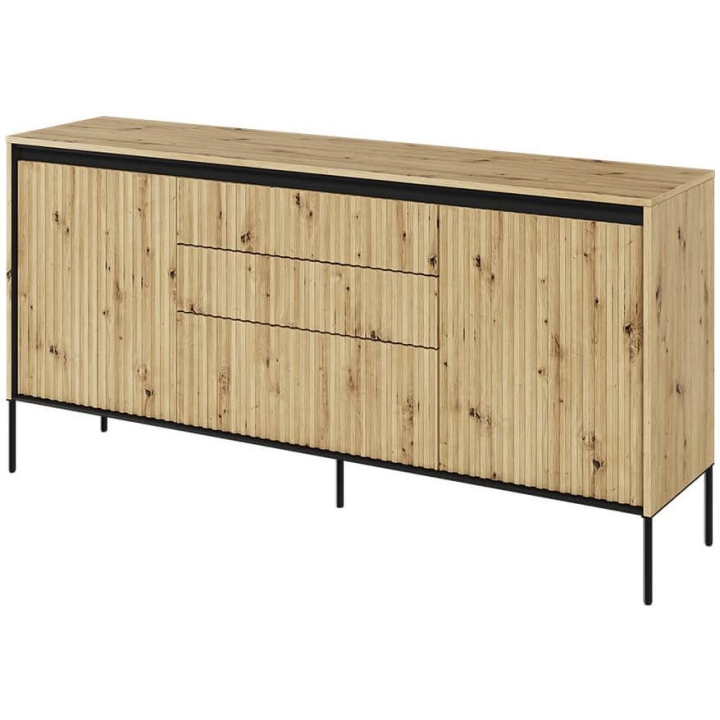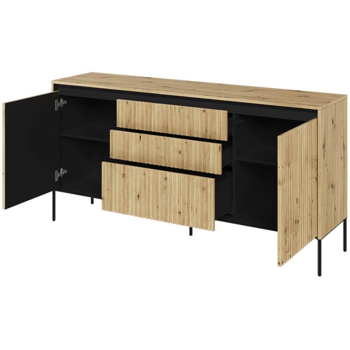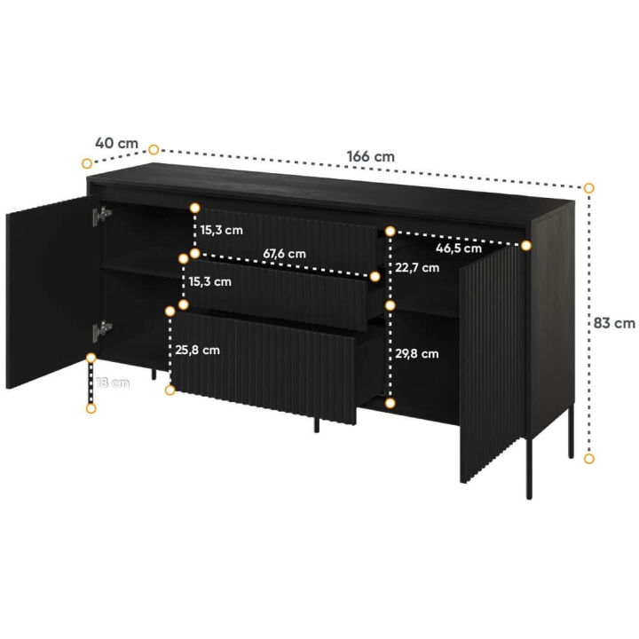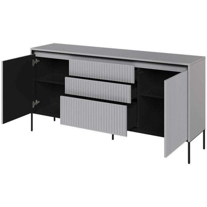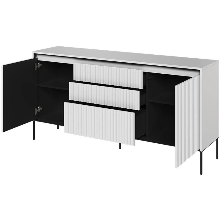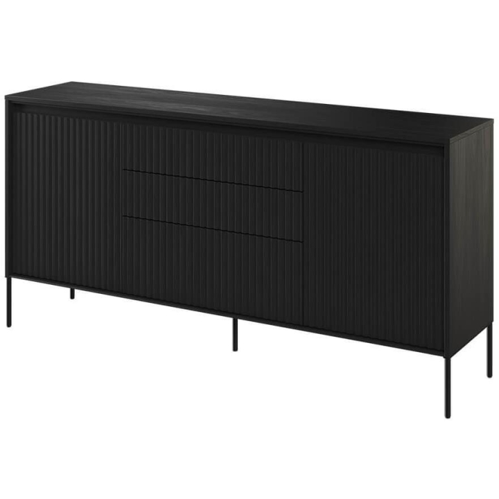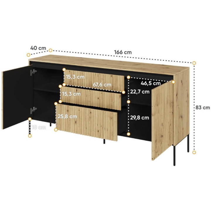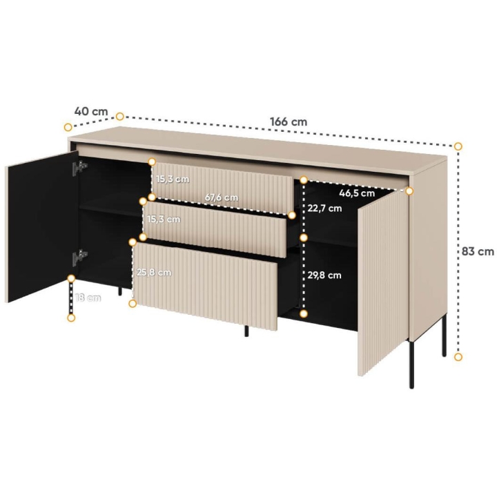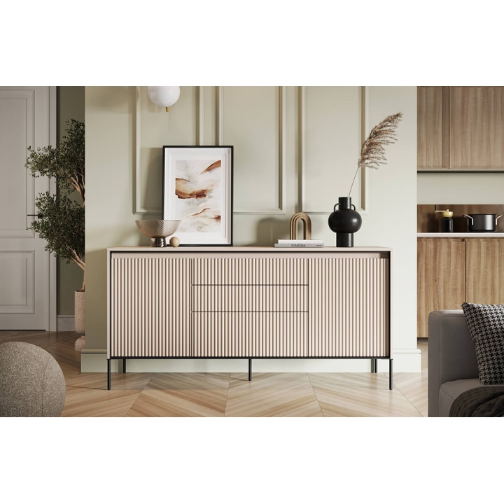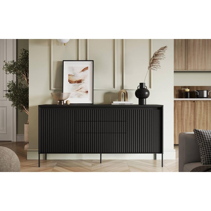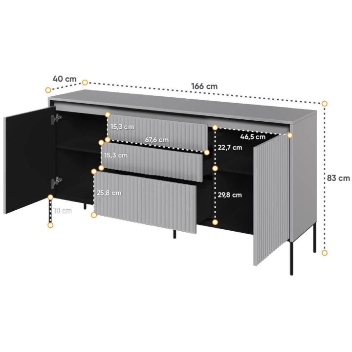 The Trend collection chest of drawers is a timeless piece of furniture made from durable laminated board in five decors - white, sand beige, black, artisan oak and grey. This unique piece of furniture, which has LED lighting included, will fit perfectly into modern and classic interiors. Its dimensions - 166 cm wide, 83 cm high, 40 cm deep - allow for storage of clothes, decorations, bedding and other items, making it extremely practical. The chest of drawers - two doors with 3 drawers - is the perfect piece of furniture for displaying your collectables. Assembly requires little effort and the end result is satisfying. The chest of drawers blends perfectly with other pieces from the Trend collection, especially with the display cabinets, creating a coherent and functional space. Characteristic elements are the fluted fronts, which add an interesting and unique style to the cabinet. Equipped with a push to open system.