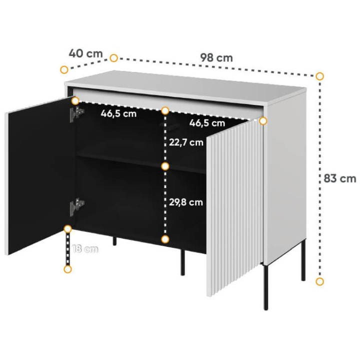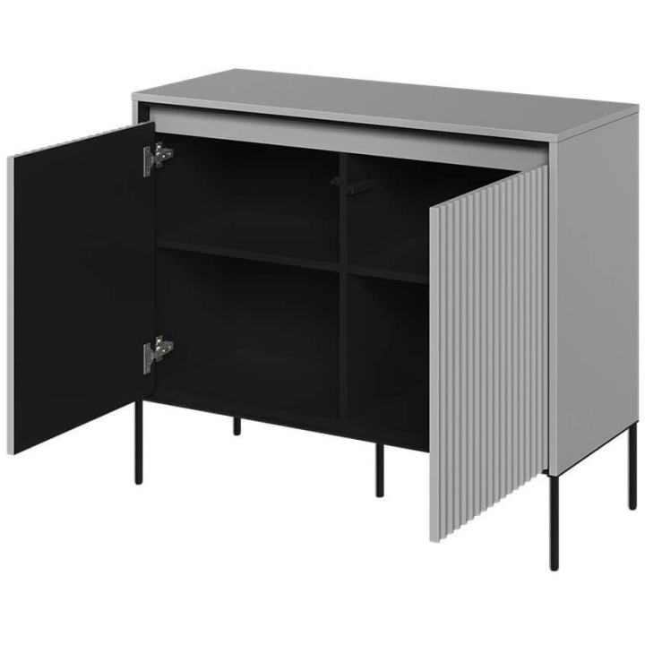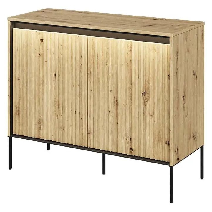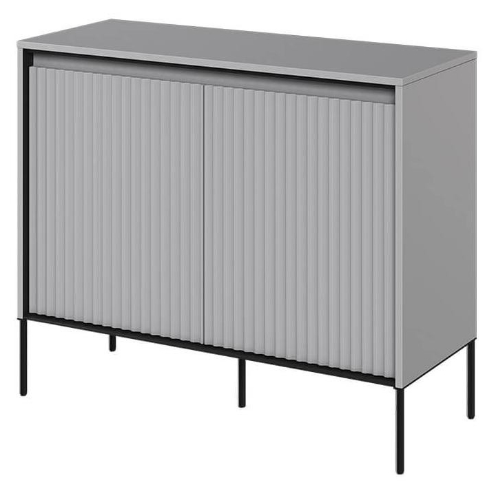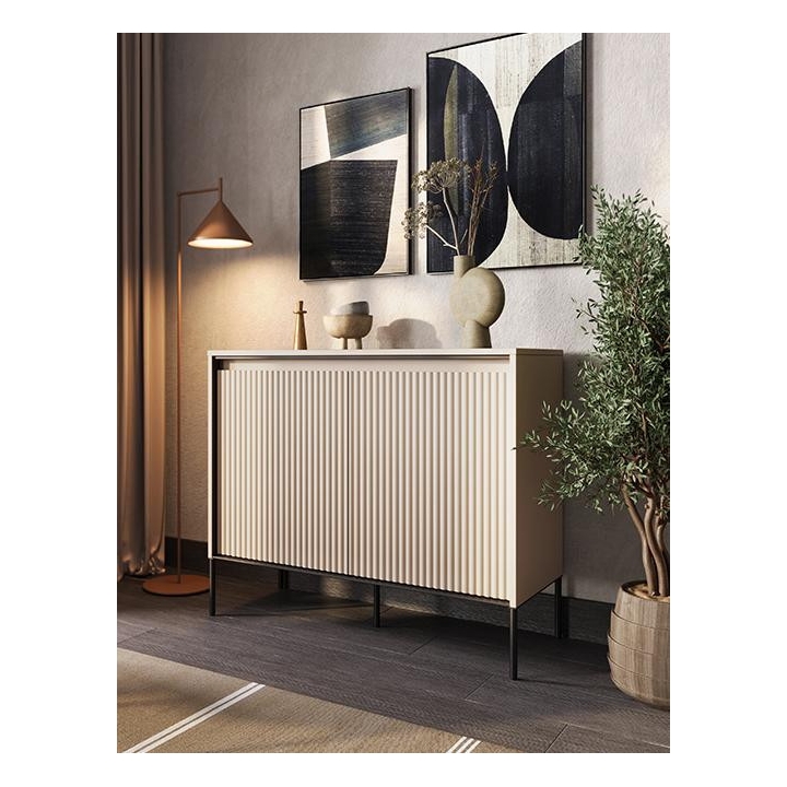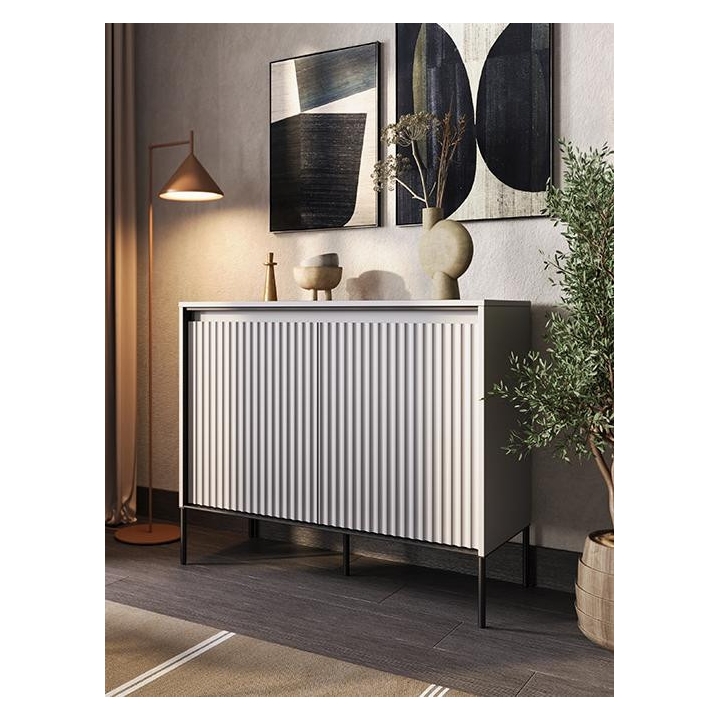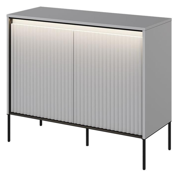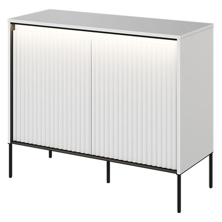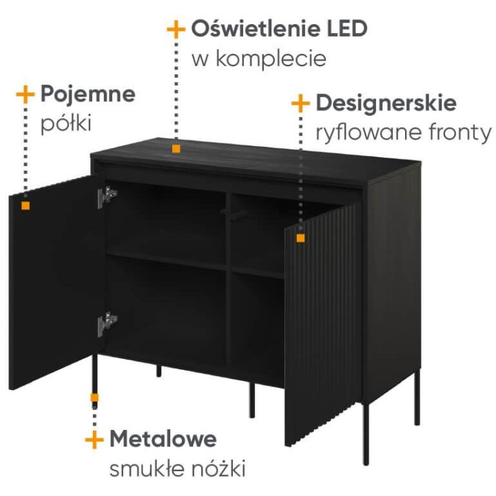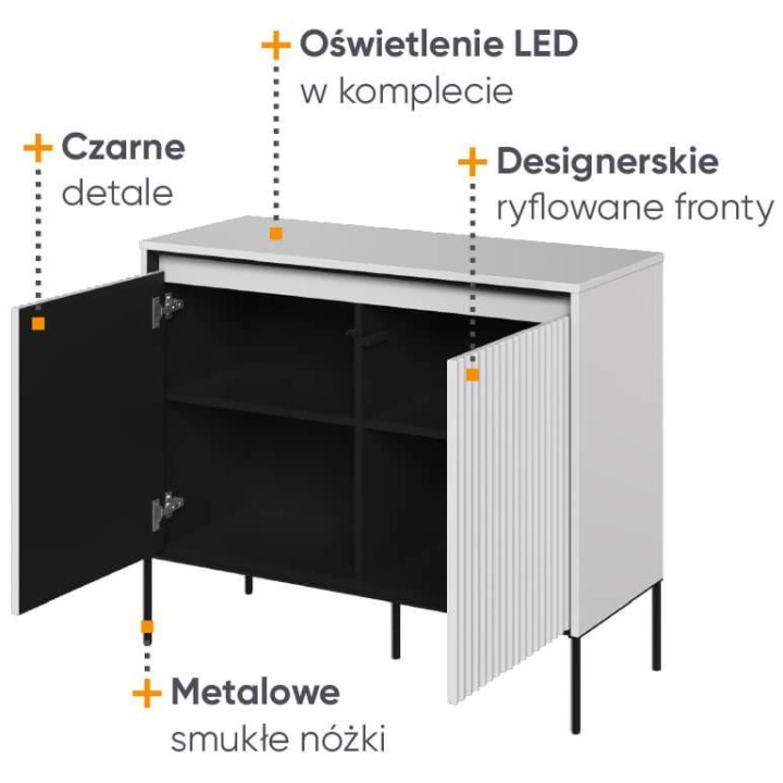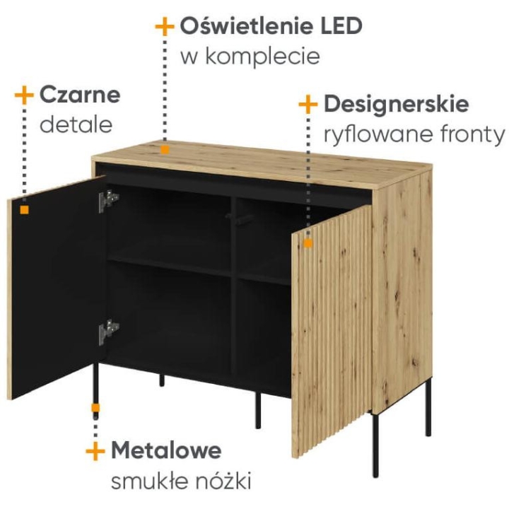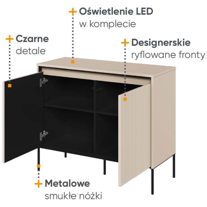 The Trend collection chest of drawers is a timeless piece of furniture made from durable laminated board in five decors - white, sand beige, black, artisan oak and grey. This unique piece of furniture, which has LED lighting included, will fit perfectly into modern and classic interiors. Its dimensions - 98 cm wide, 83 cm high, 40 cm deep - allow for storage of clothes, decorations, bedding and other items, making it extremely practical. The chest of drawers - four doors - is the perfect piece of furniture for displaying your collectables. Assembly requires little effort and the end result is satisfying. The chest of drawers blends perfectly with other pieces from the Trend collection, especially with display cabinets, creating a coherent and functional space. Characteristic elements are the fluted fronts, which add an interesting and unique style to the cabinet. Equipped with a push to open system.